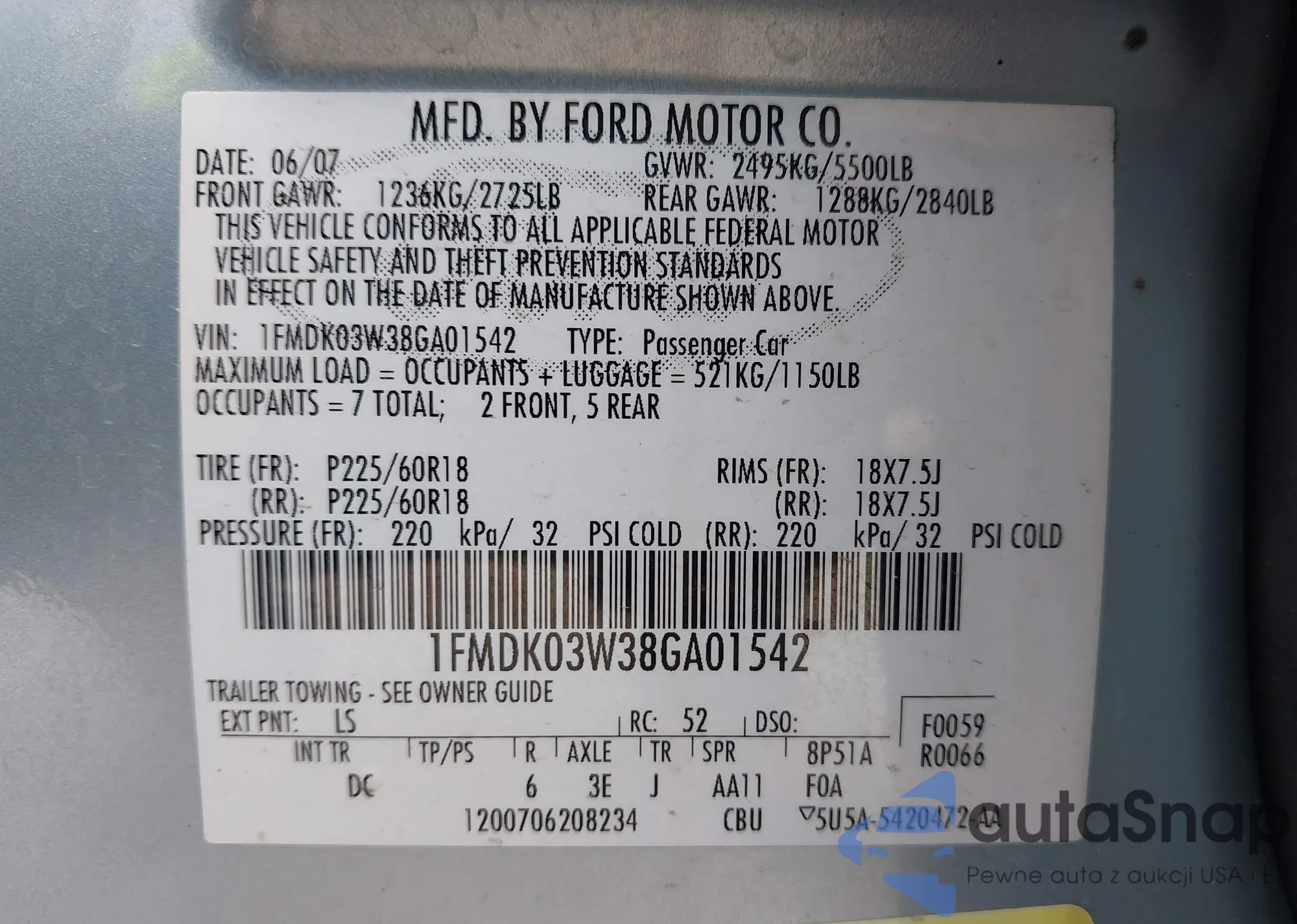 • VIN: 1FMDK03W38GA01542