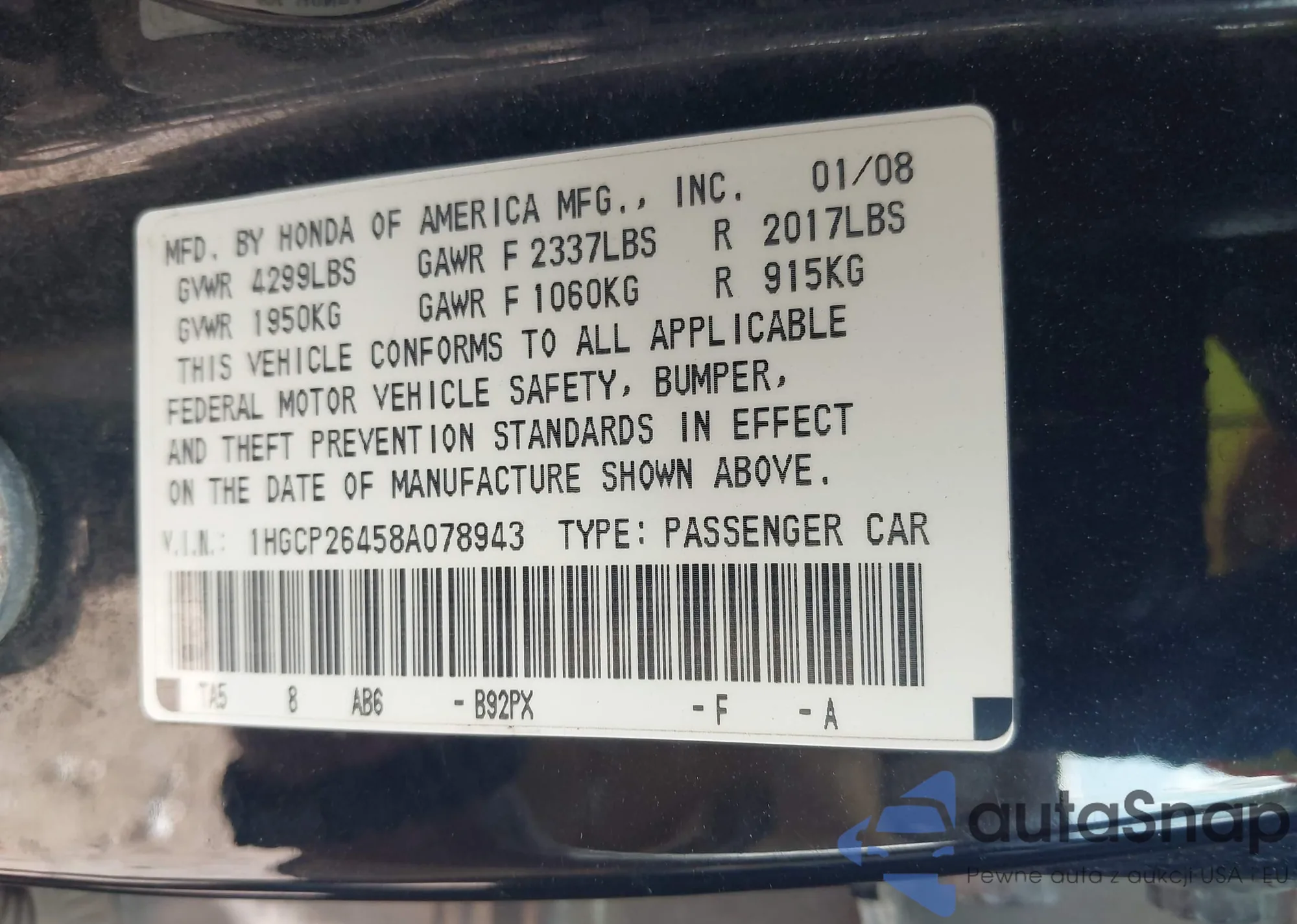 VIN: 1HGCP26458A078943