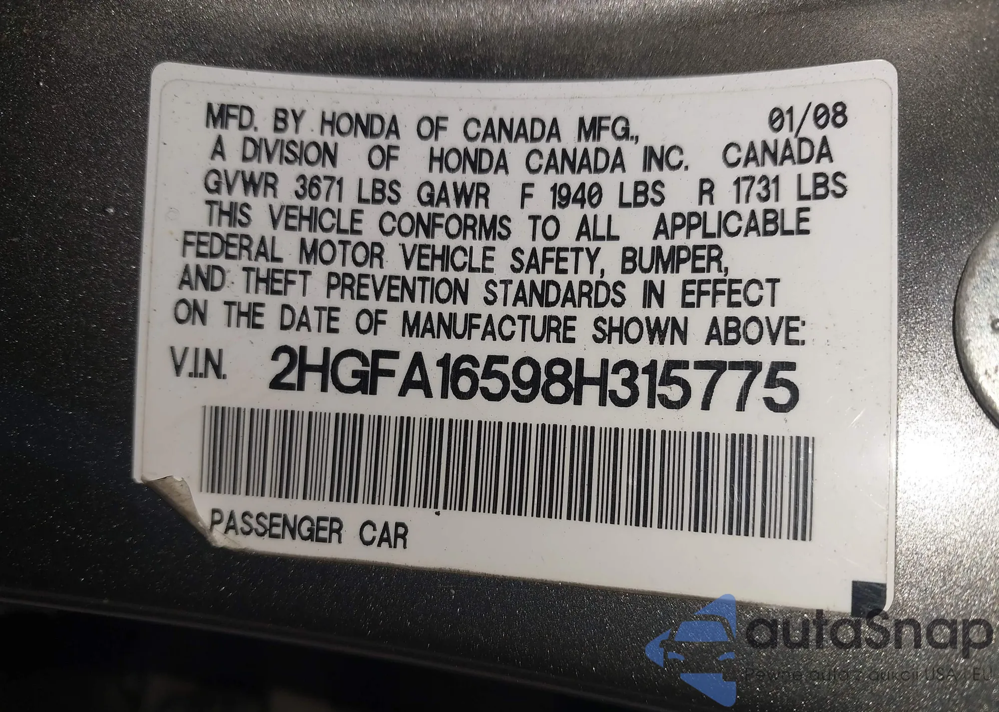 VIN: 2HGFA16598H315775