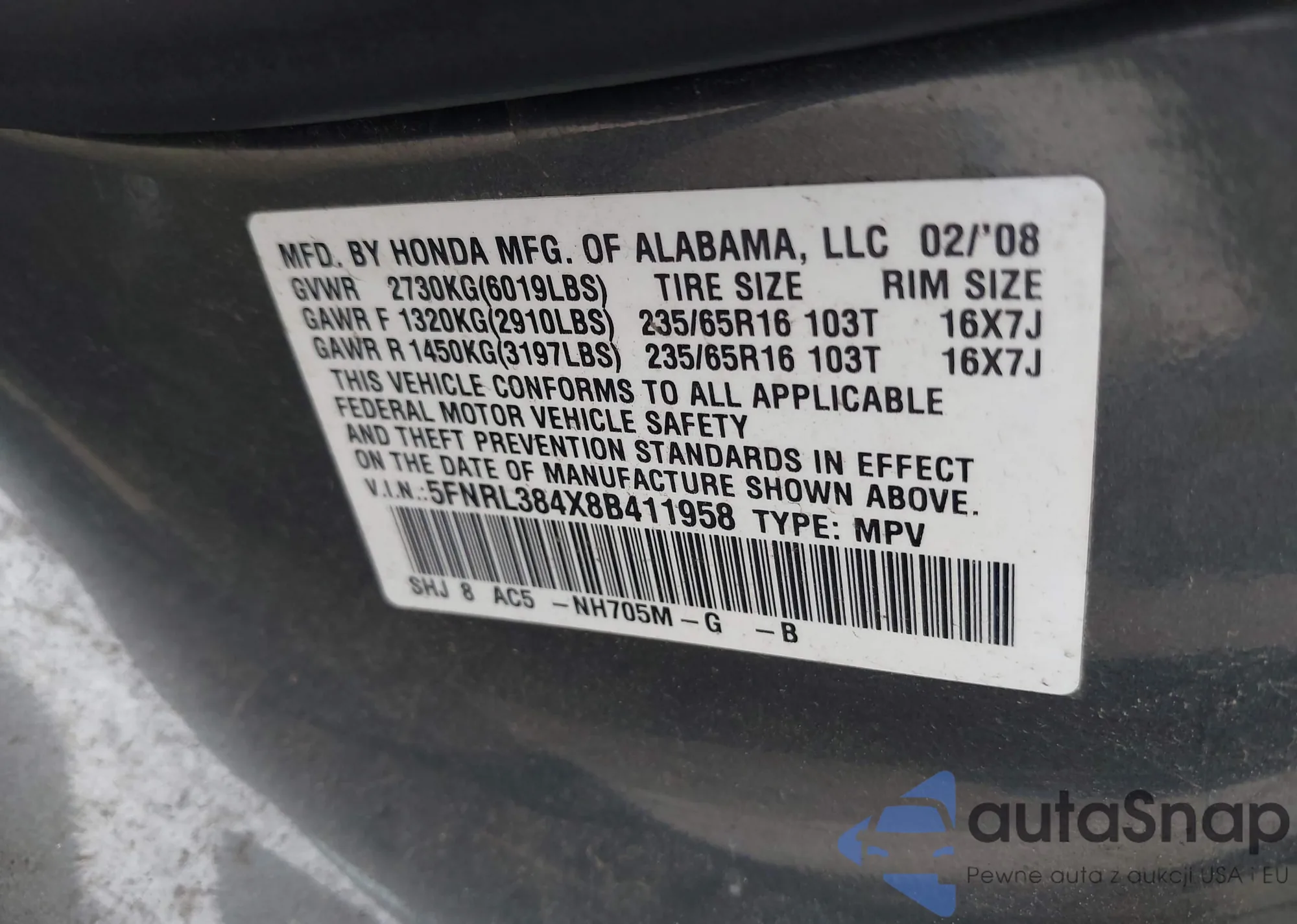VIN: 5FNRL384X8B411958