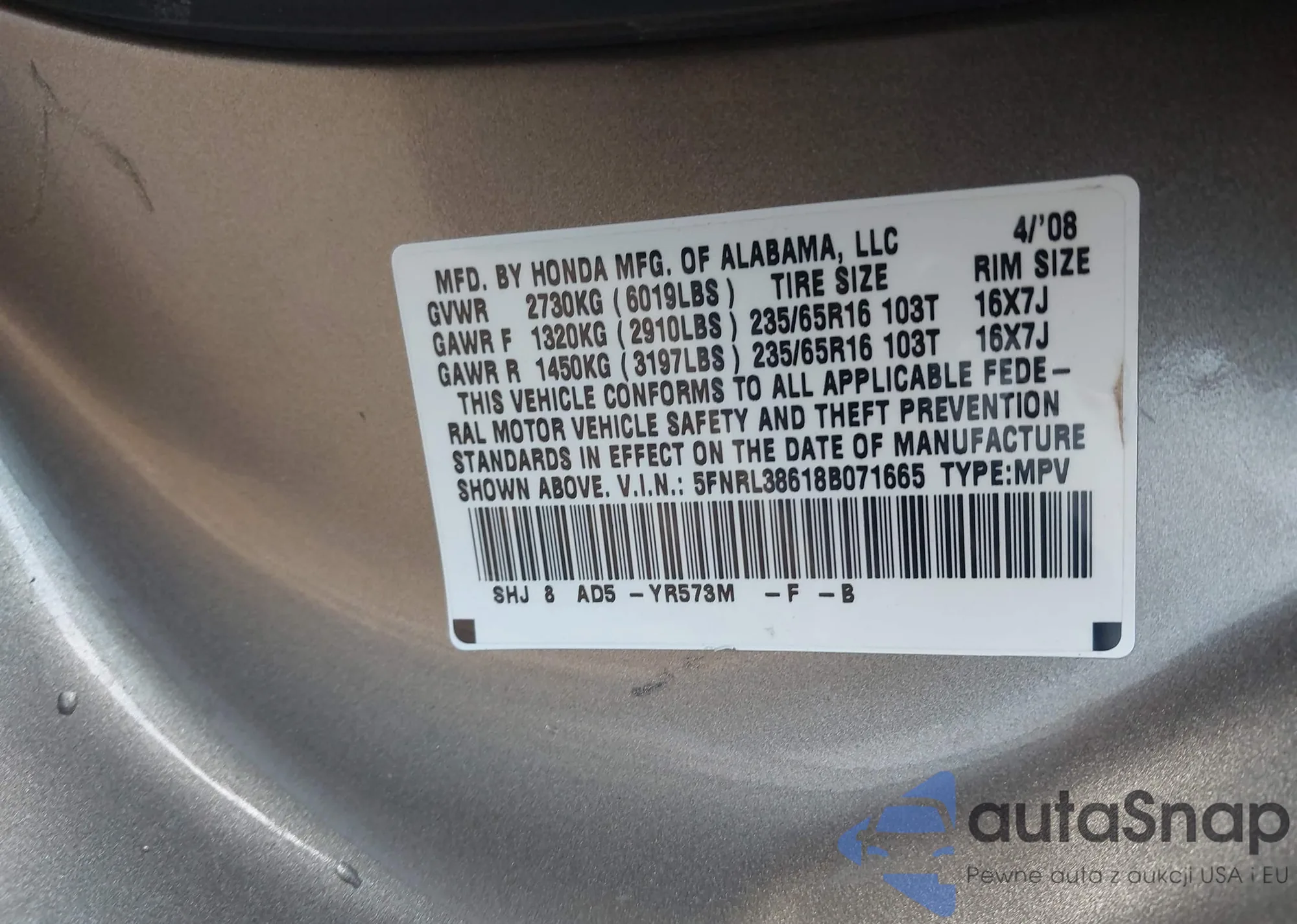 VIN: 5FNRL38618B071665