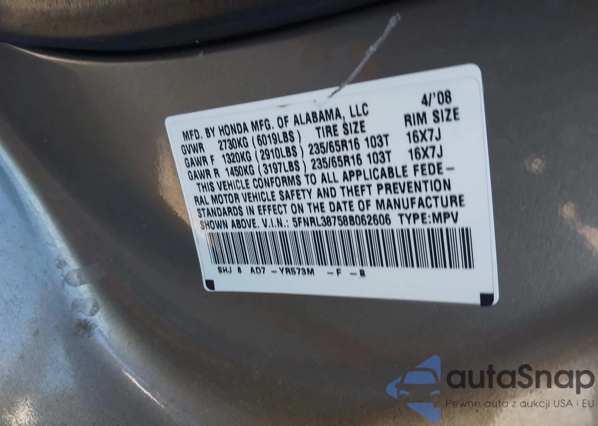 VIN: 5FNRL38758B062606