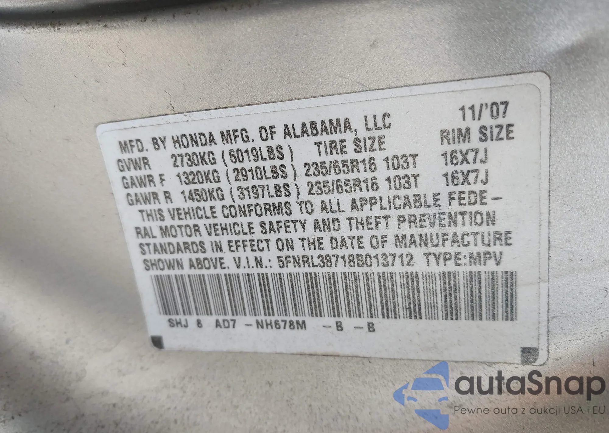 VIN: 5FNRL38718B013712
