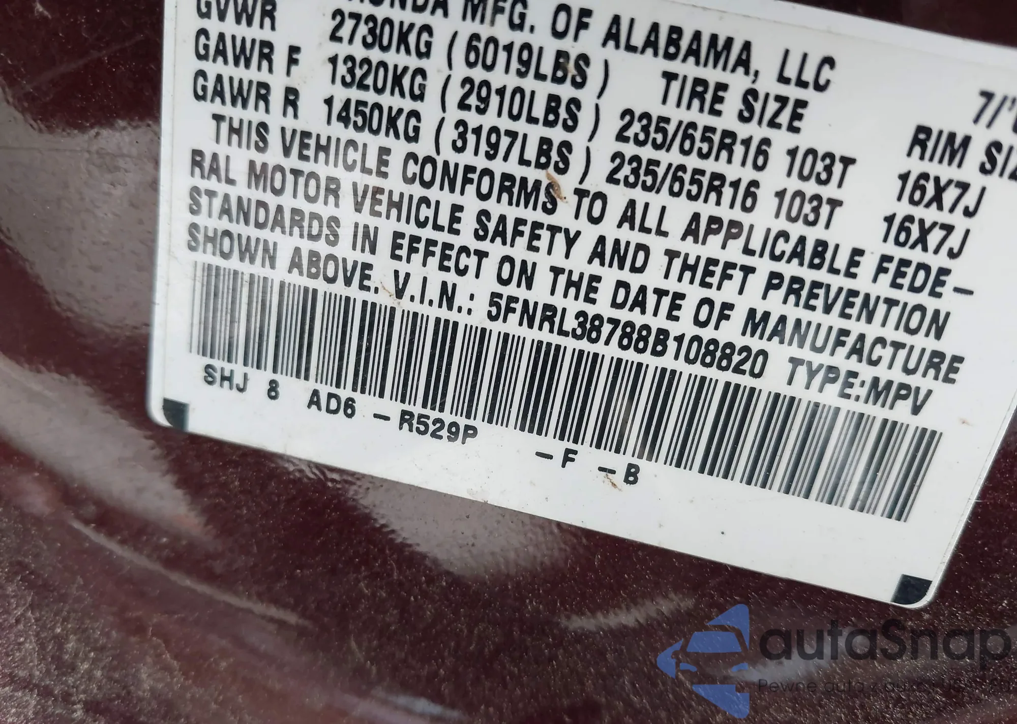 VIN: 5FNRL38788B108820