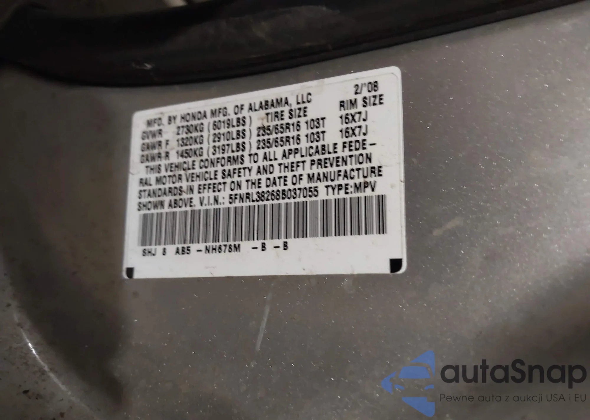 Автомобиль Honda Odyssey 2008 (VIN 5FNRL38268B037055) ранее не участвовал в торгах. Документы чистые, пробег соответствует или ниже среднего по рынку. Продаётся страховой компанией — рекомендуем покупку. Доставка в порт займет около 6–8 недель.