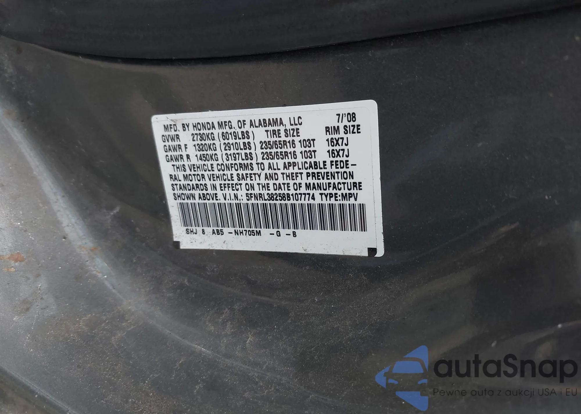 VIN: 5FNRL38258B107774