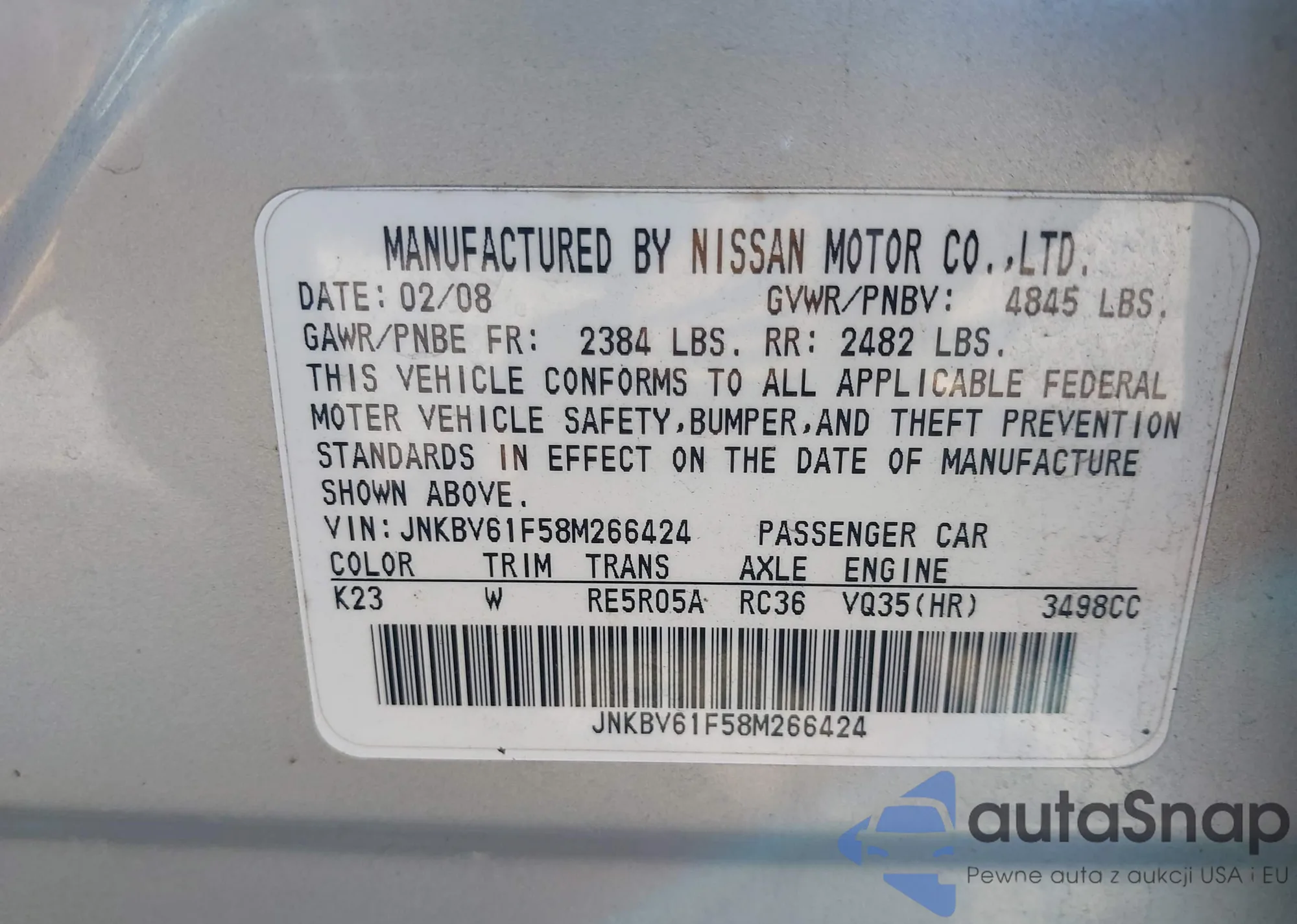 Автомобиль Infiniti G 2008 (VIN JNKBV61F58M266424) продаётся непроверенным продавцом. Рекомендуем проверить отчет Carfax и подтвердить возможность регистрации перед покупкой.