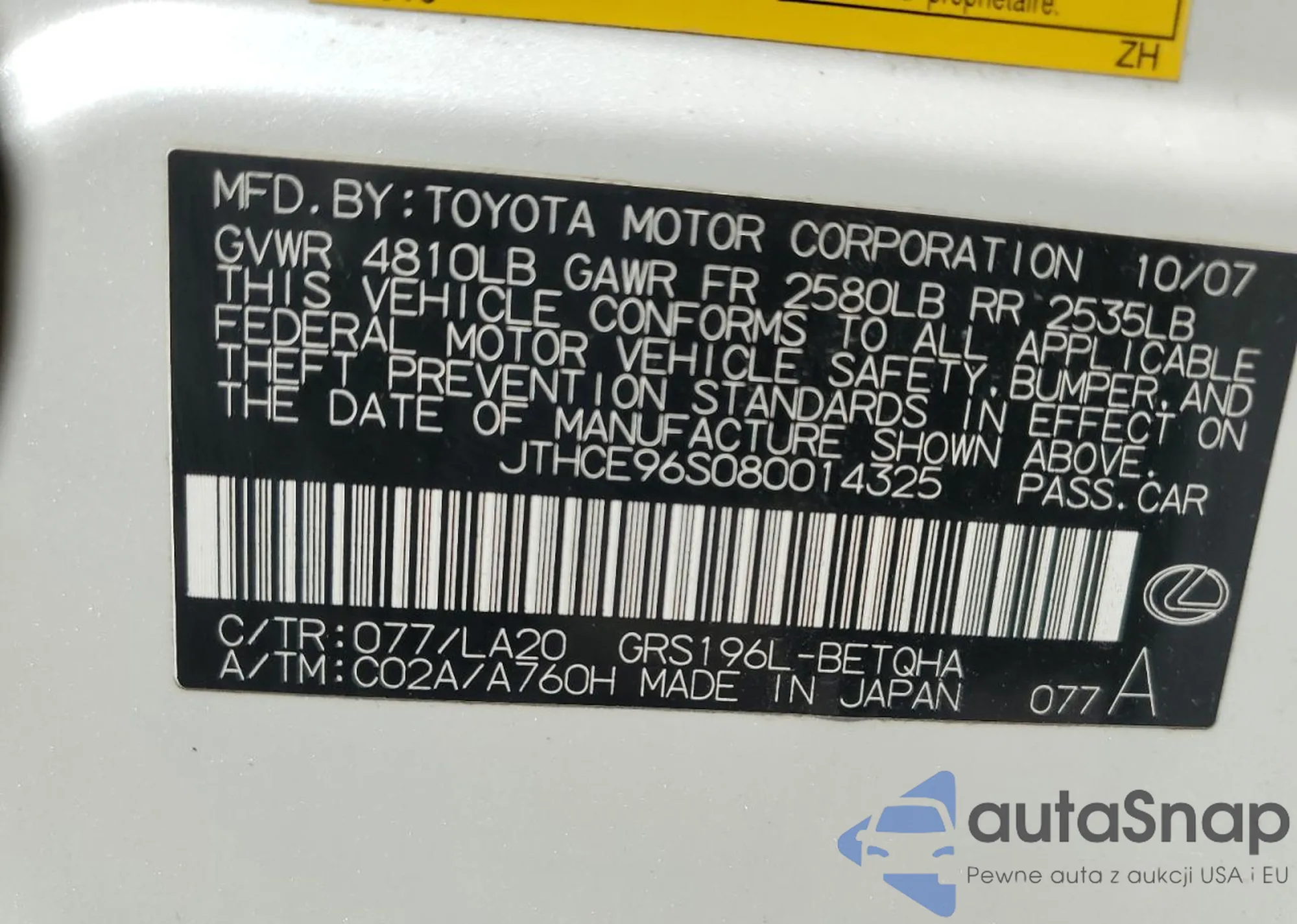 VIN: JTHCE96S080014325