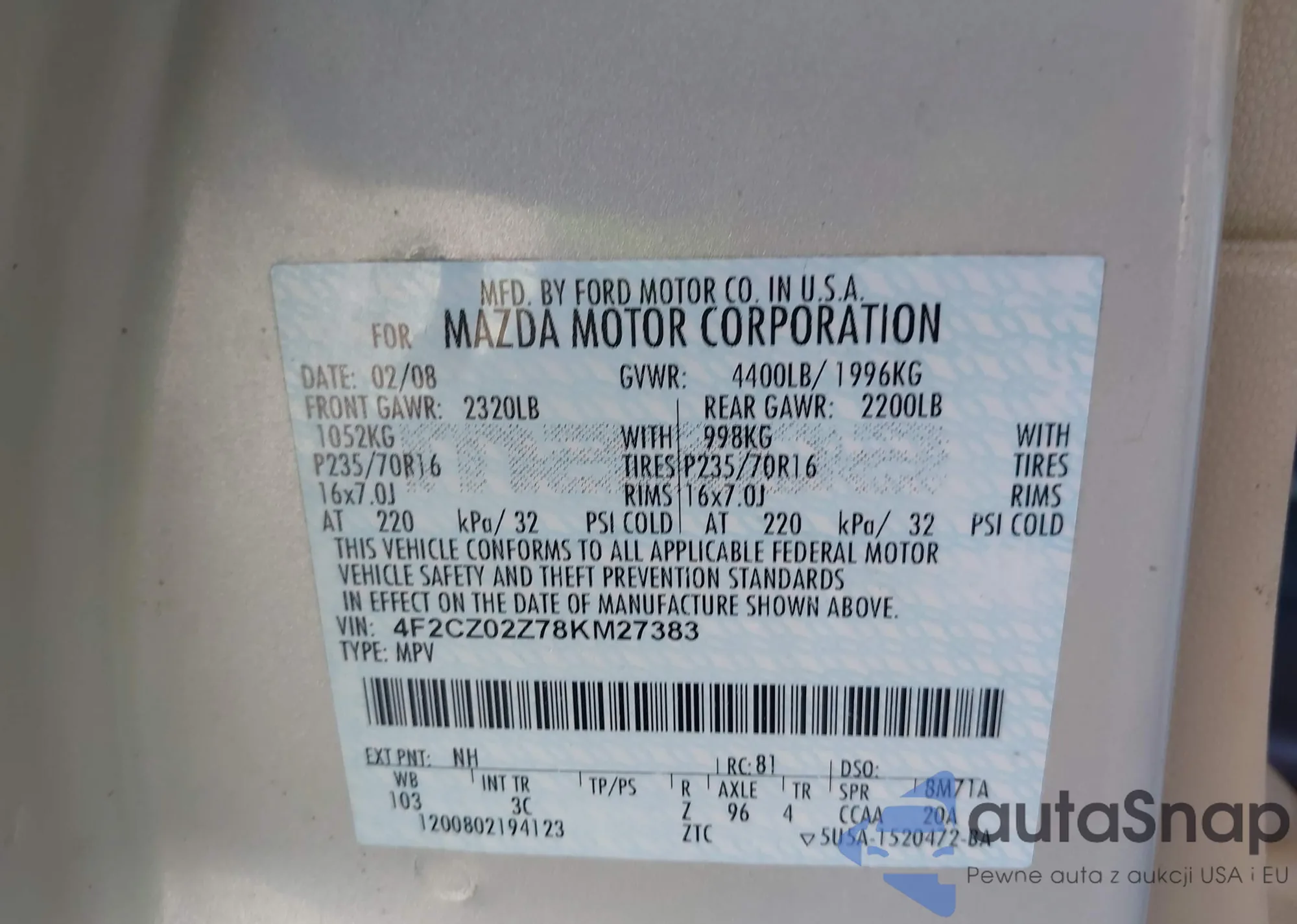 • VIN: 4F2CZ02Z78KM27383