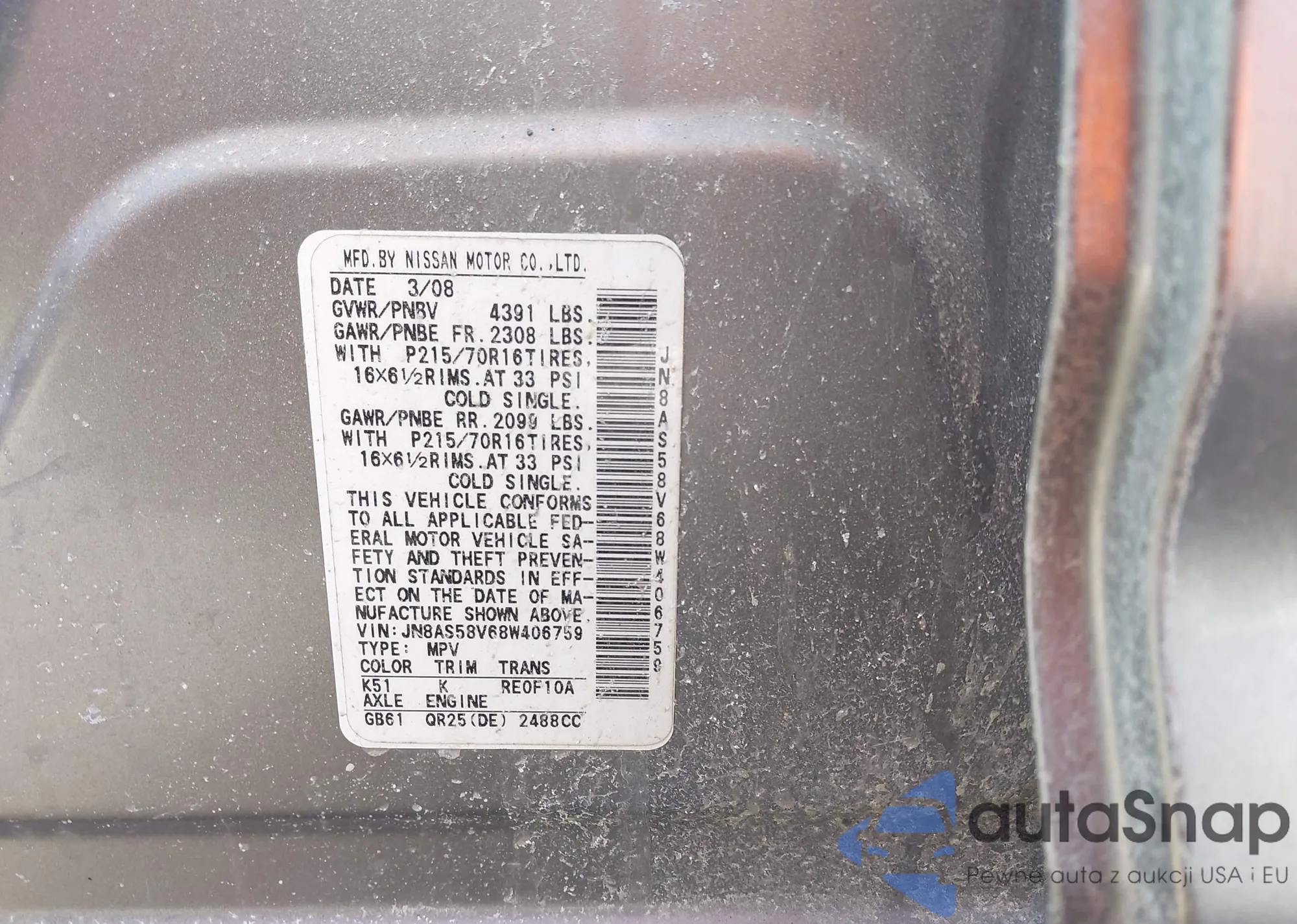 Автомобиль Nissan Rogue 2008 (VIN JN8AS58V68W406759) ранее не участвовал в торгах. Документы чистые, пробег соответствует или ниже среднего по рынку. Продаётся страховой компанией — рекомендуем покупку. Доставка в порт займет около 6–8 недель.