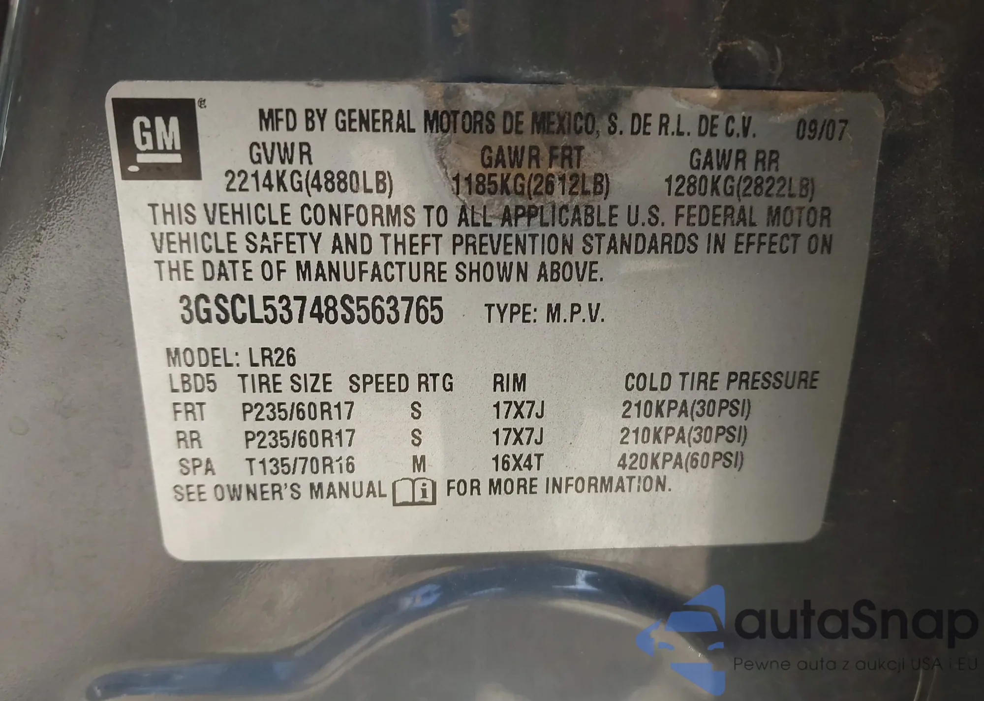 Автомобиль Saturn VUE 2008 (VIN 3GSCL53748S563765) имеет документы, препятствующие регистрации. Могут возникнуть сложности при экспорте и регистрации. Обратитесь к экспертам AutaSnap для поиска альтернатив.