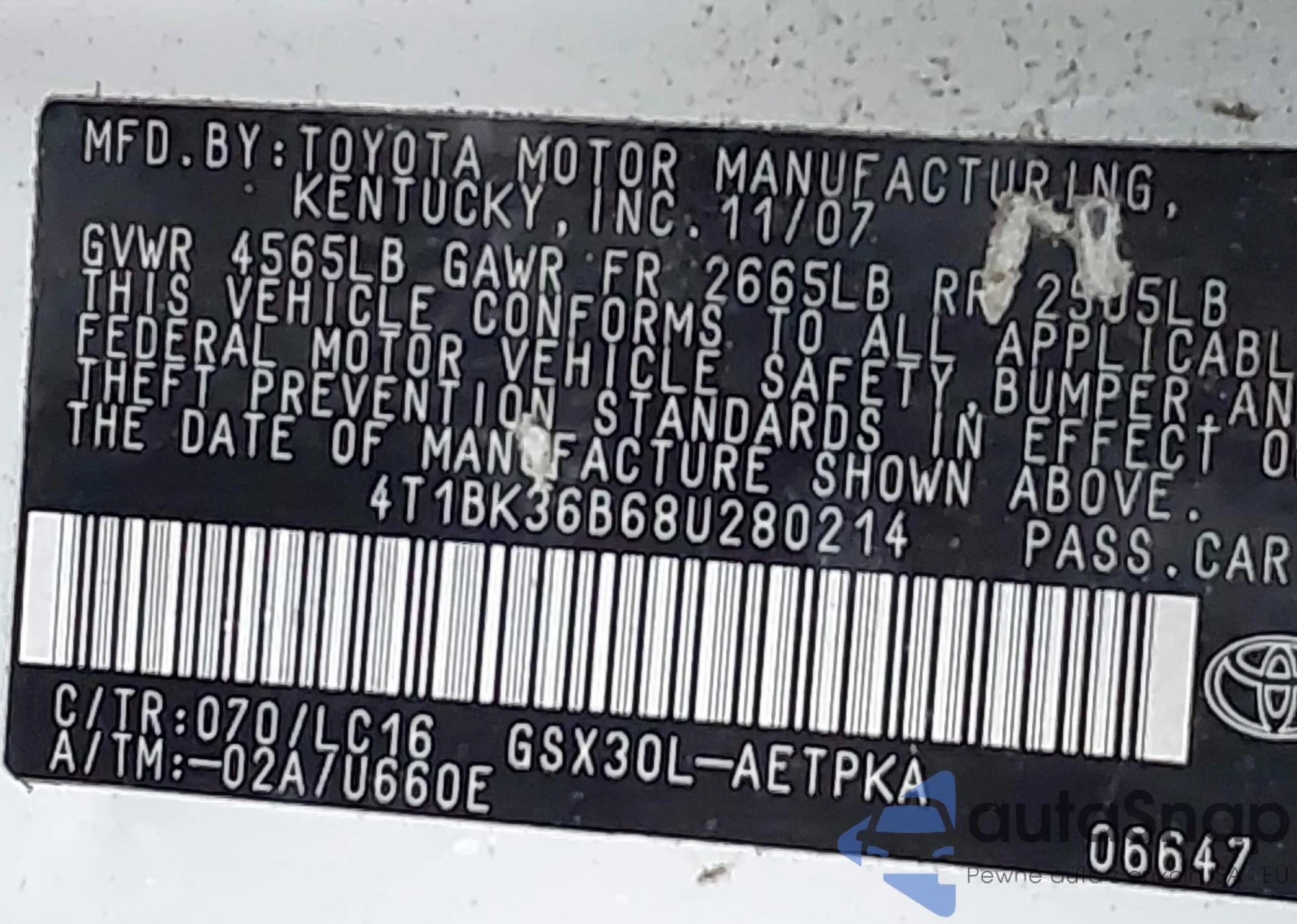 • VIN: 4T1BK36B68U280214