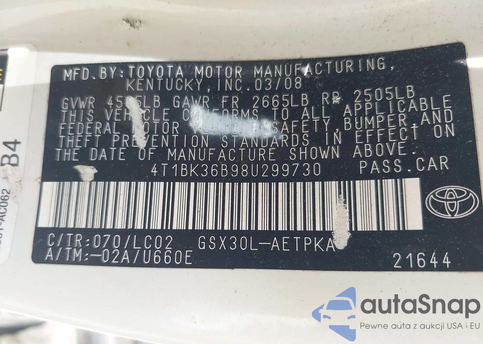 VIN: 4T1BK36B98U299730