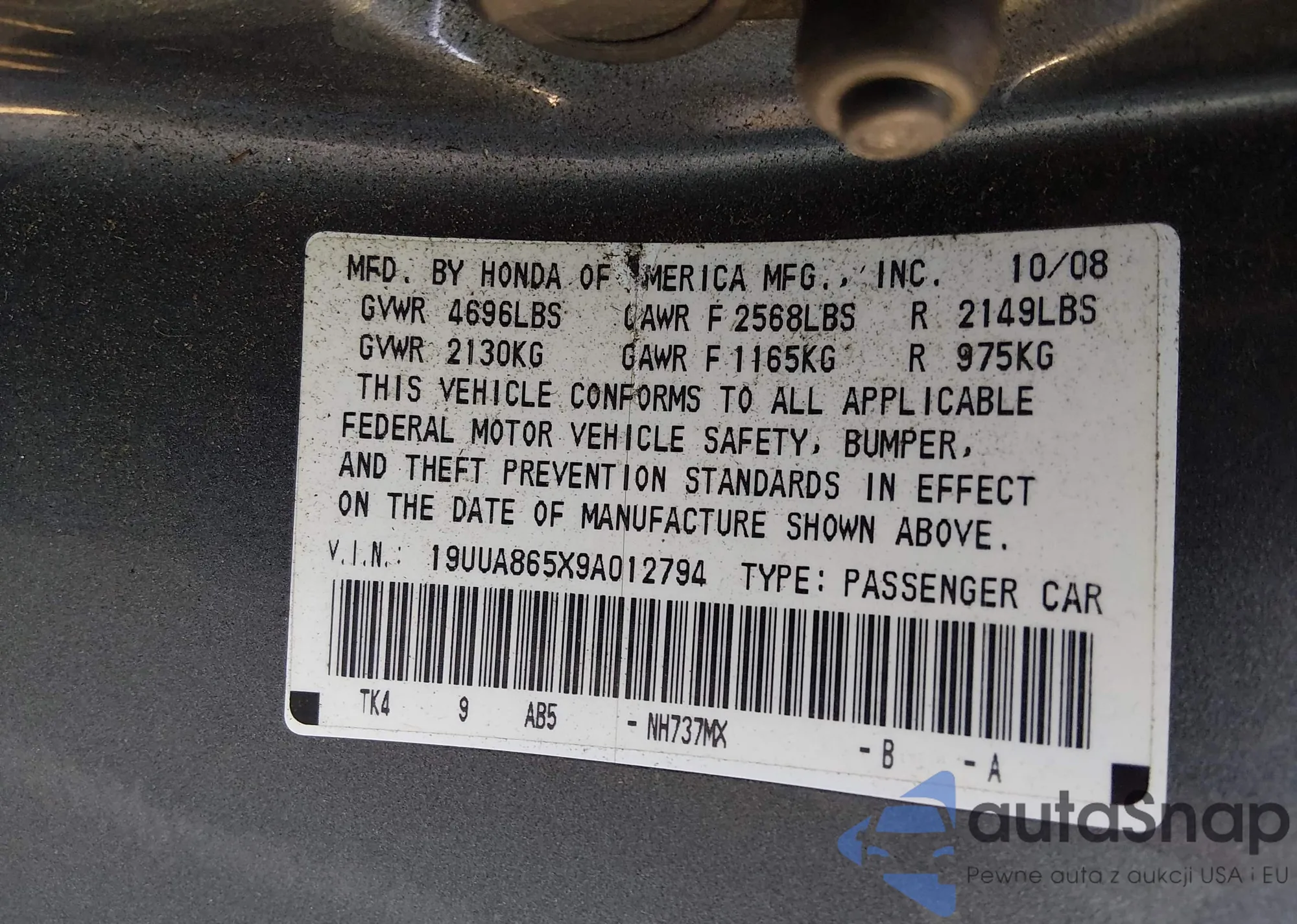 • VIN: 19UUA865X9A012794