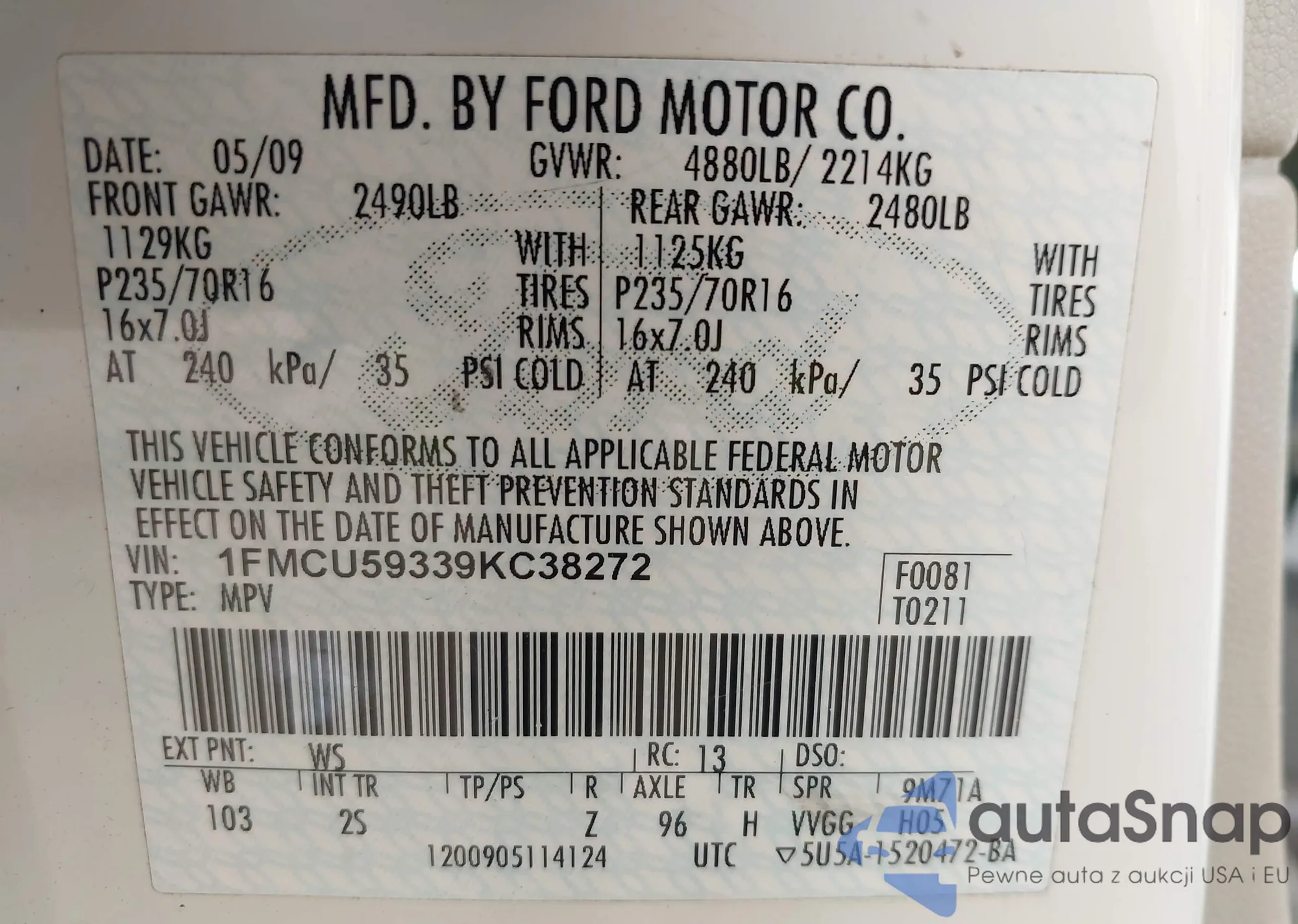 • VIN: 1FMCU59339KC38272