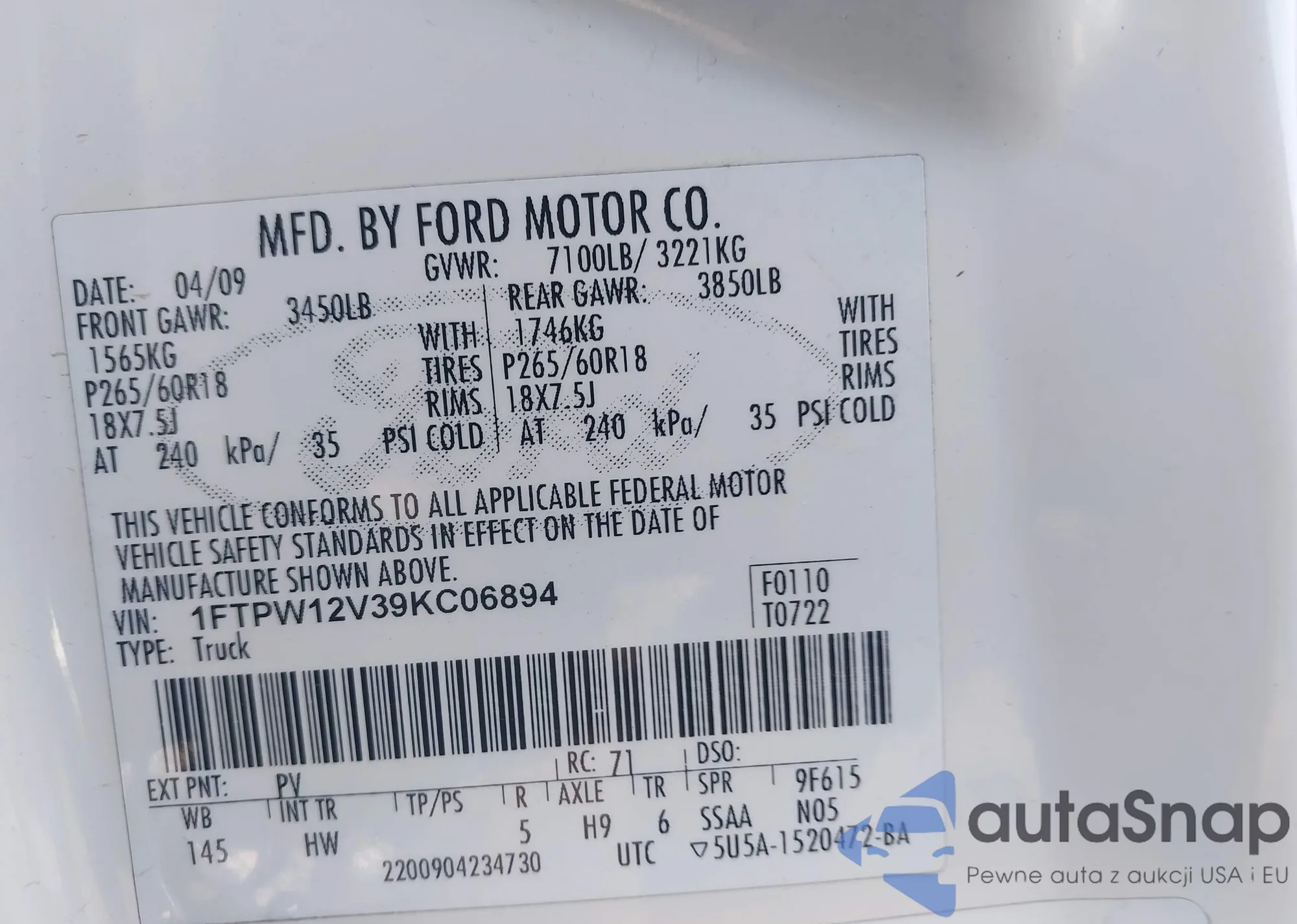 VIN: 1FTPW12V39KC06894