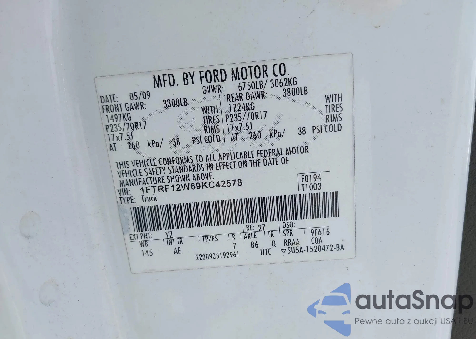 VIN: 1FTRF12W69KC42578
