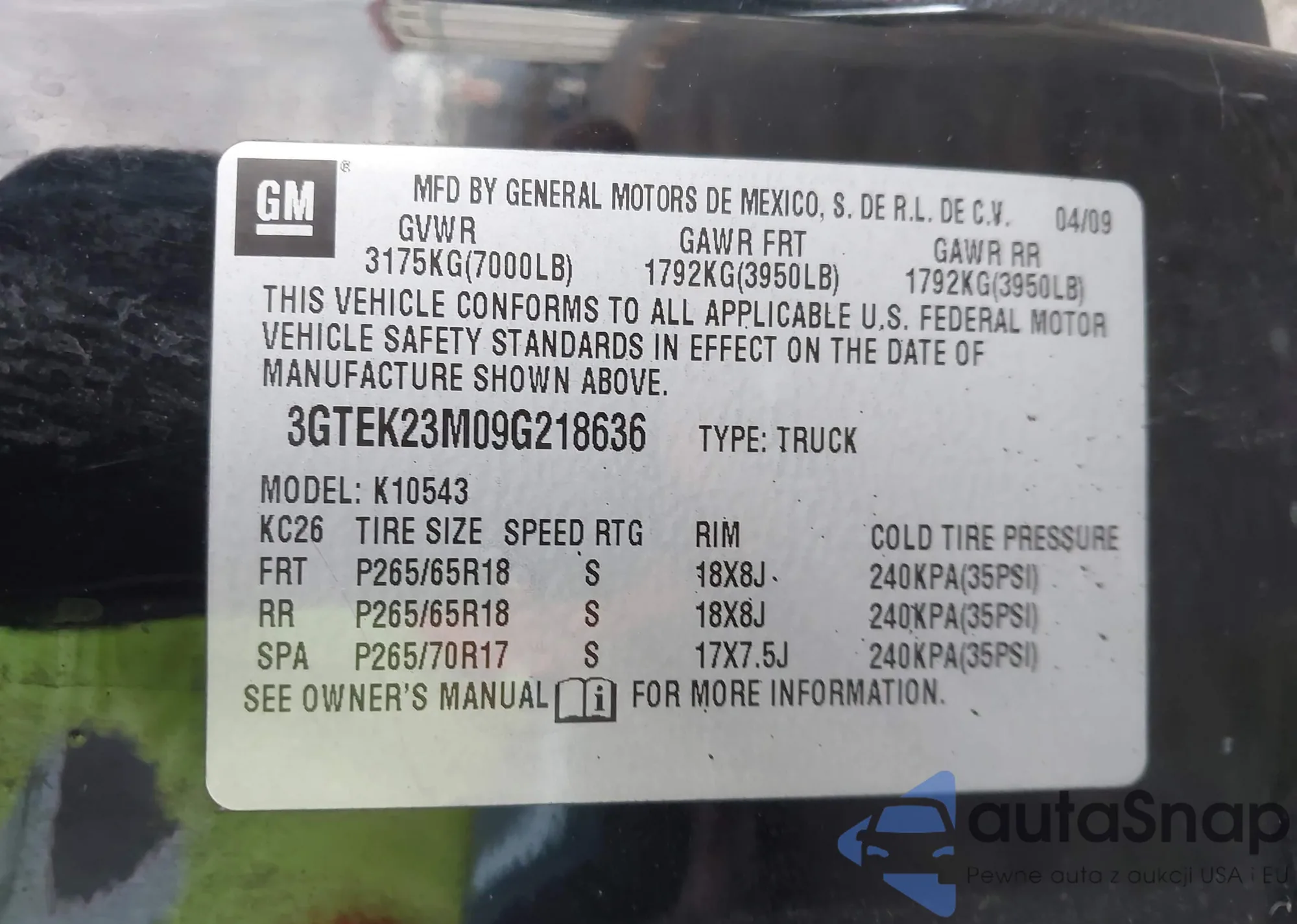 VIN: 3GTEK23M09G218636