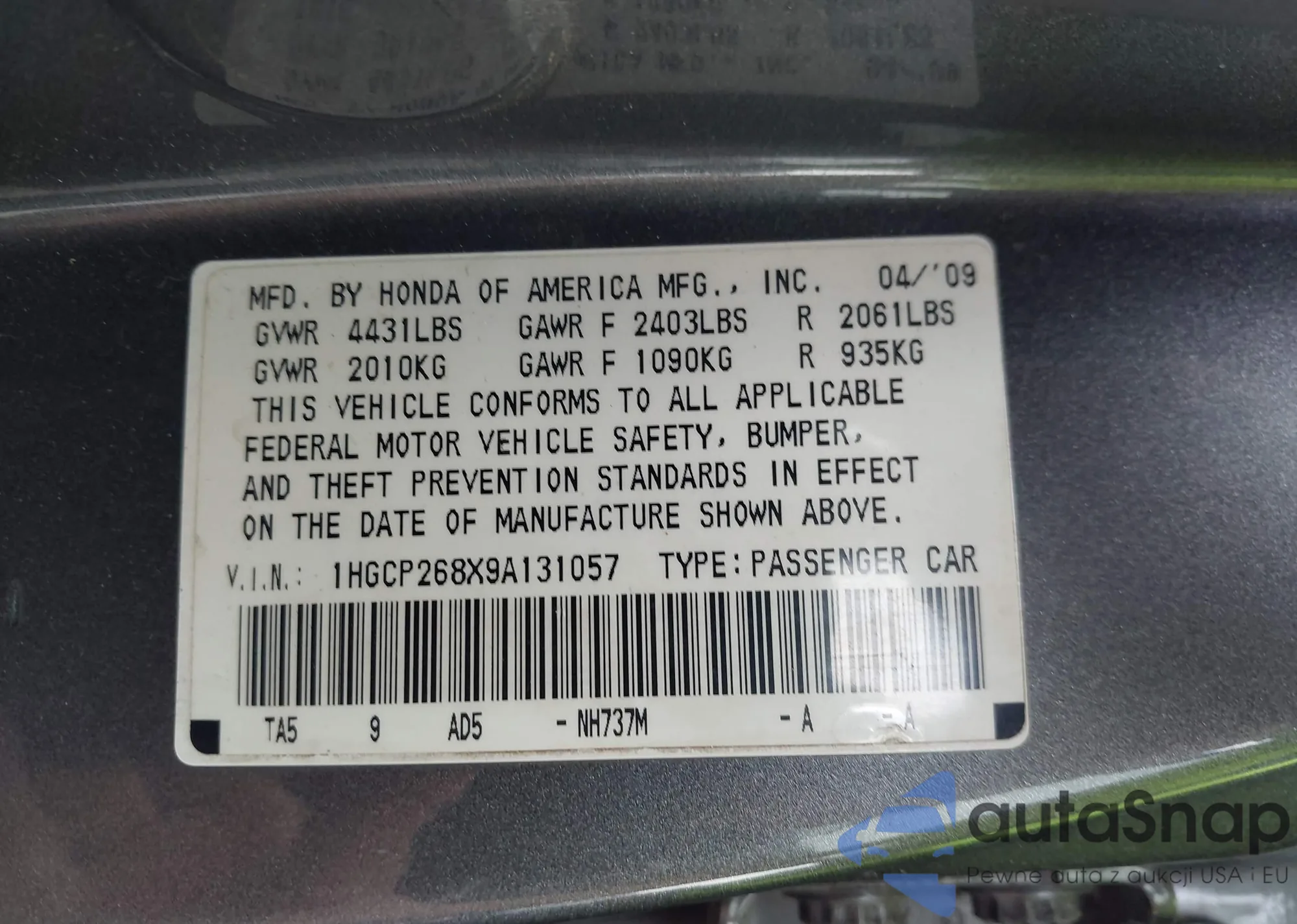 VIN: 1HGCP268X9A131057