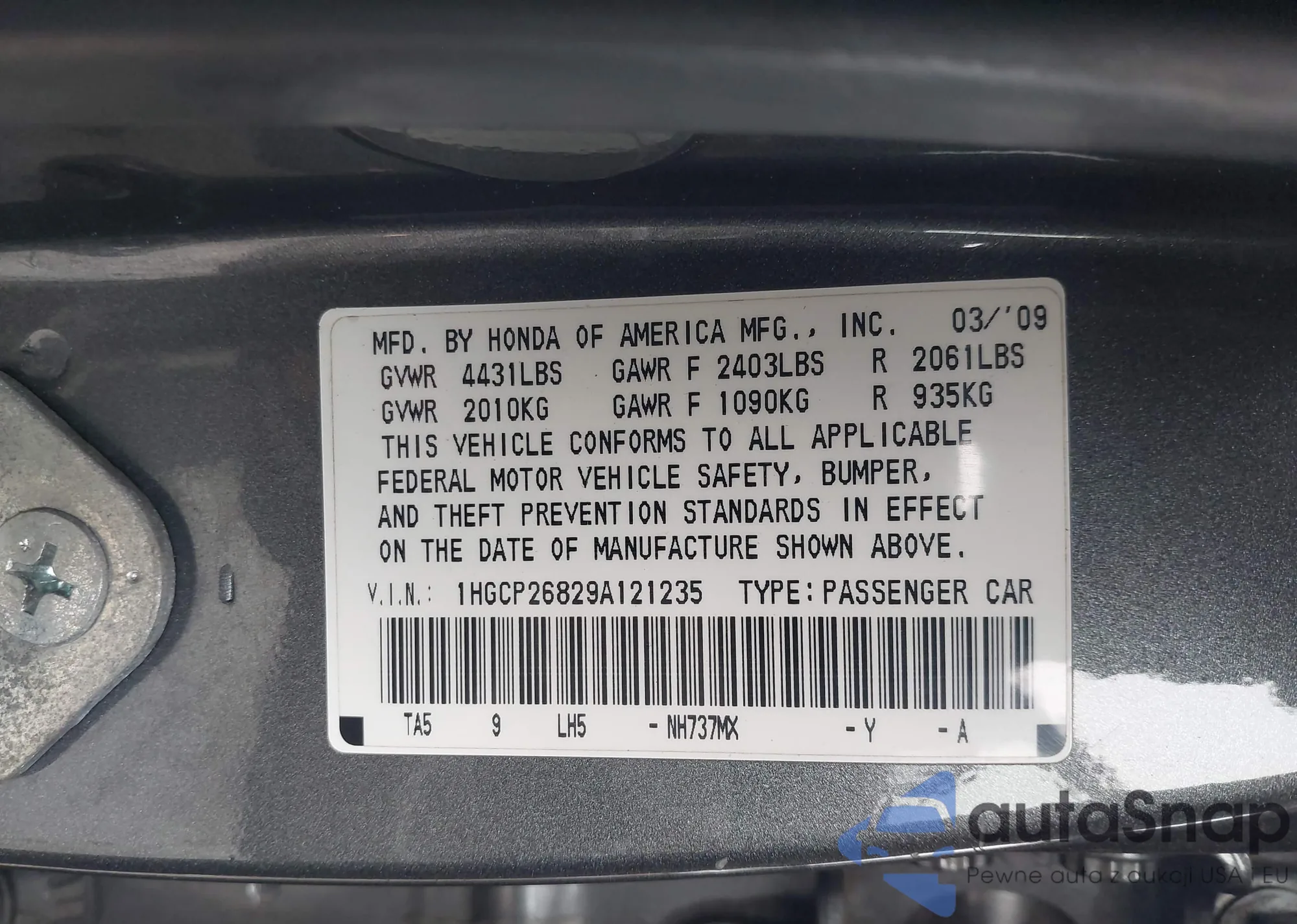 Автомобиль Honda Accord 2009 (VIN 1HGCP26829A121235) ранее не участвовал в торгах. Документы чистые, пробег соответствует или ниже среднего по рынку. Продаётся страховой компанией — рекомендуем покупку. Доставка в порт займет около 6–8 недель.