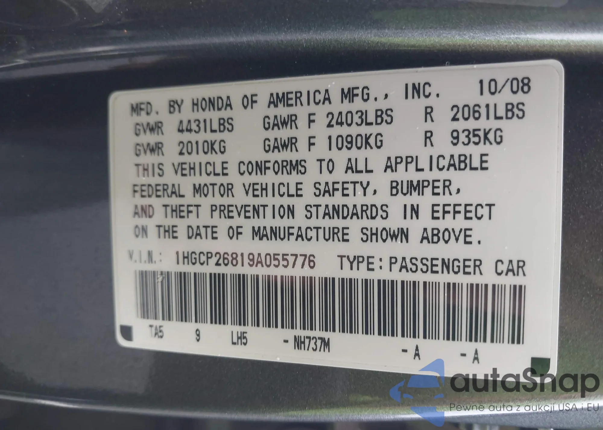 VIN: 1HGCP26819A055776