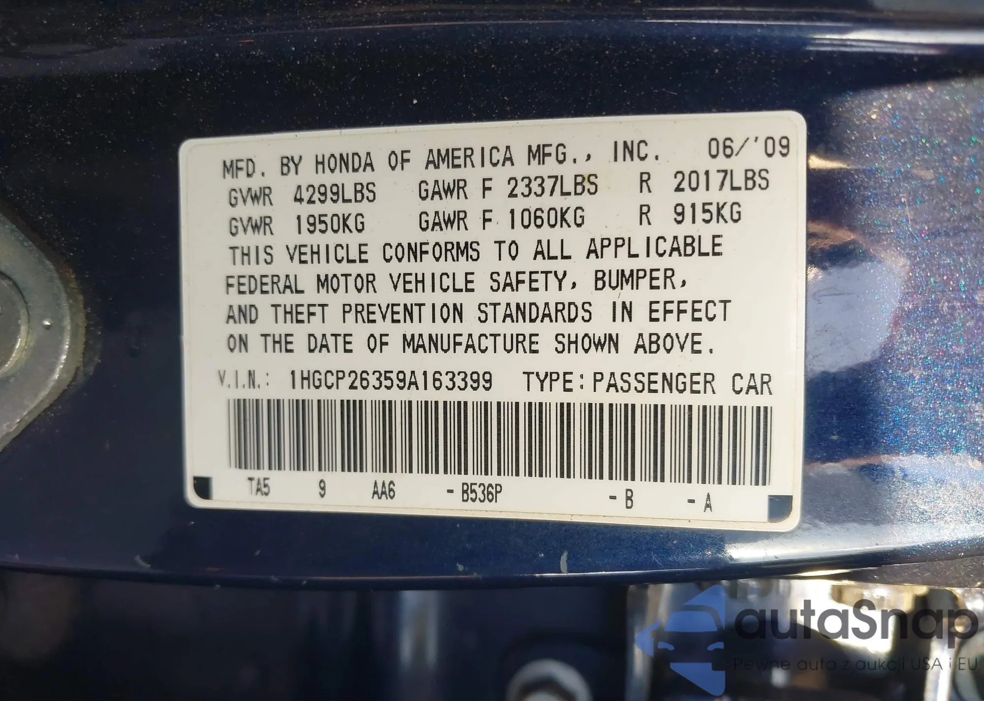 VIN: 1HGCP26359A163399