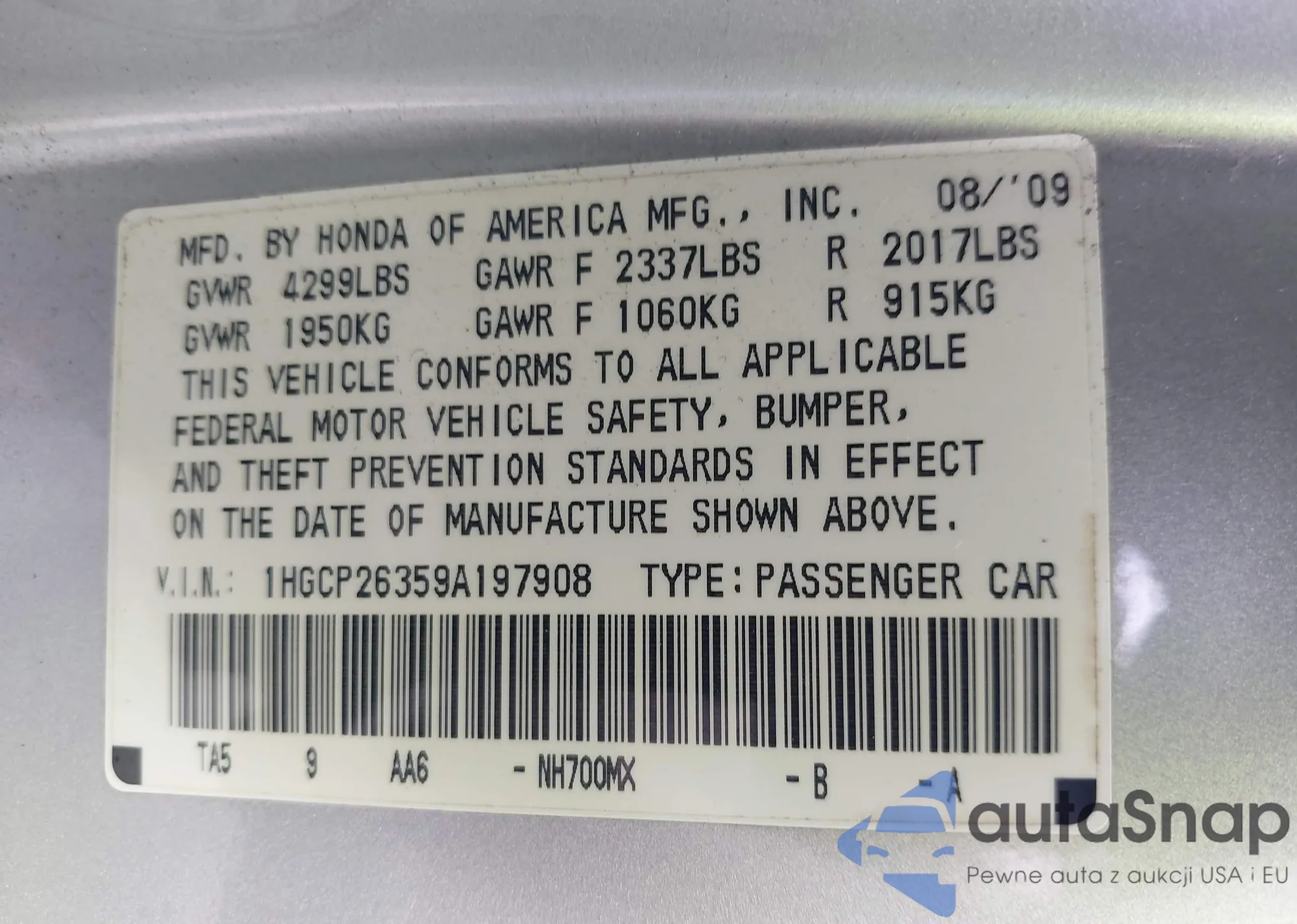 VIN: 1HGCP26359A197908