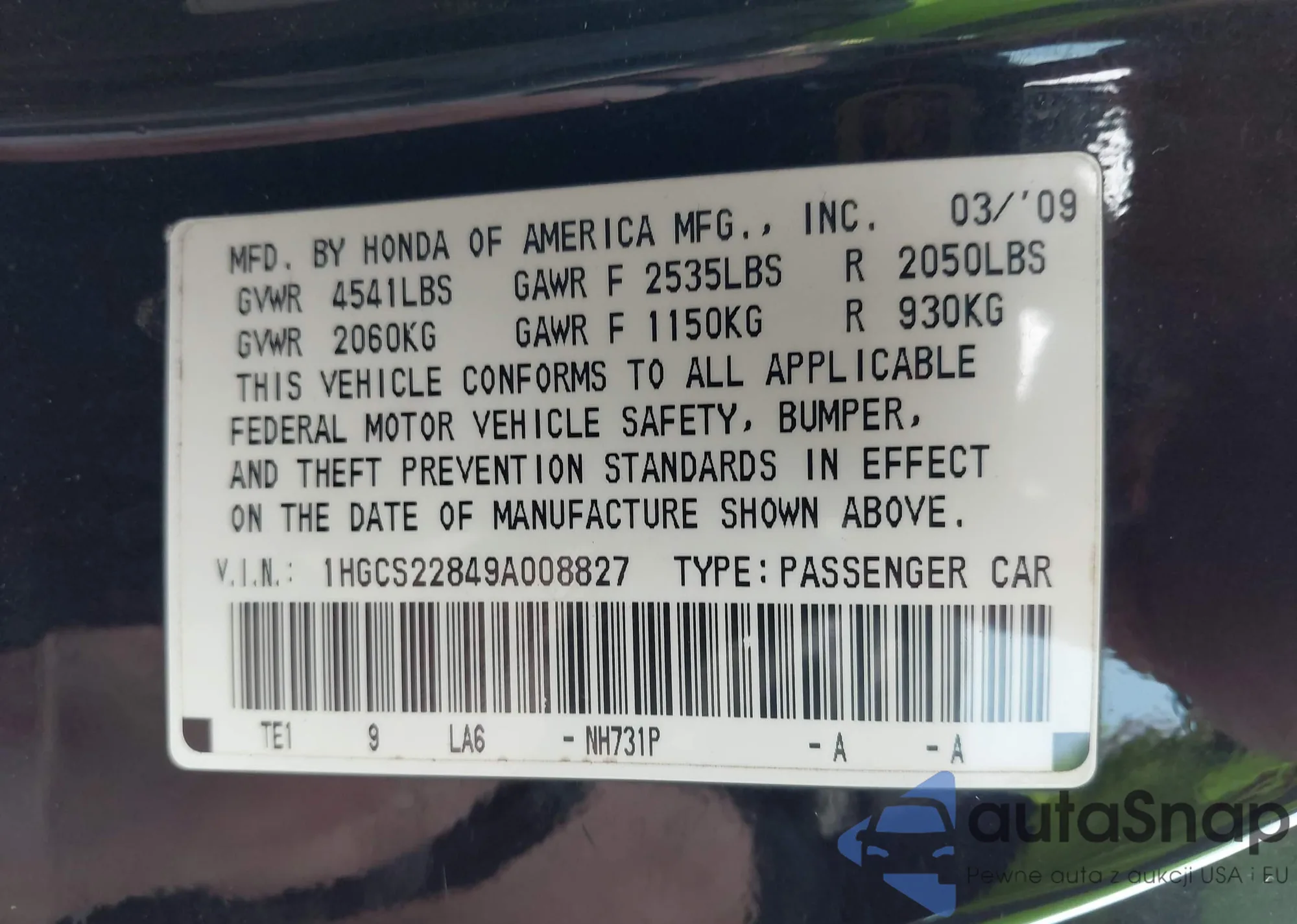 Автомобиль Honda Accord 2009 (VIN 1HGCS22849A008827) ранее не участвовал в торгах. Документы чистые, пробег соответствует или ниже среднего по рынку. Продаётся страховой компанией — рекомендуем покупку. Доставка в порт займет около 6–8 недель.