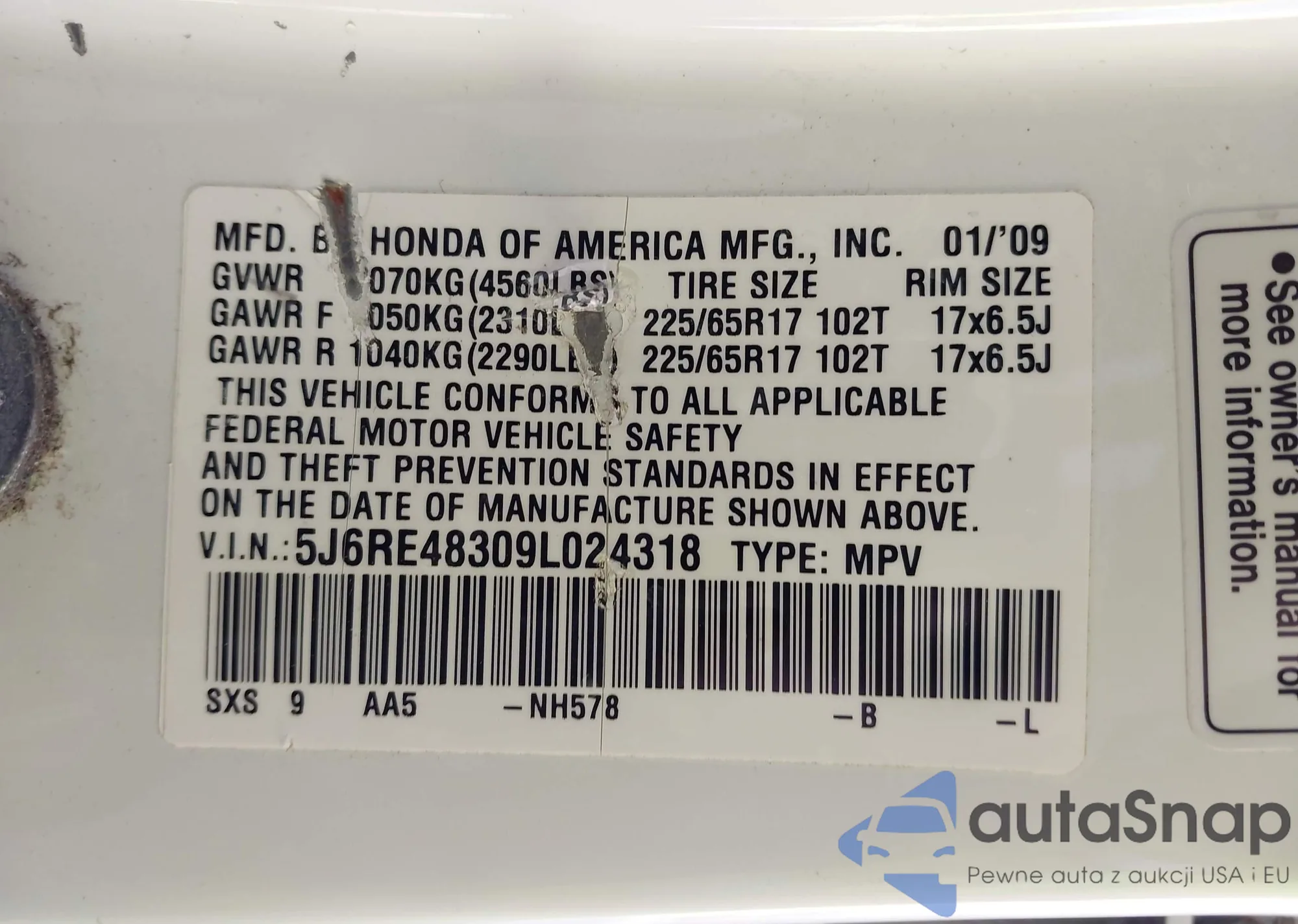 VIN: 5J6RE48309L024318