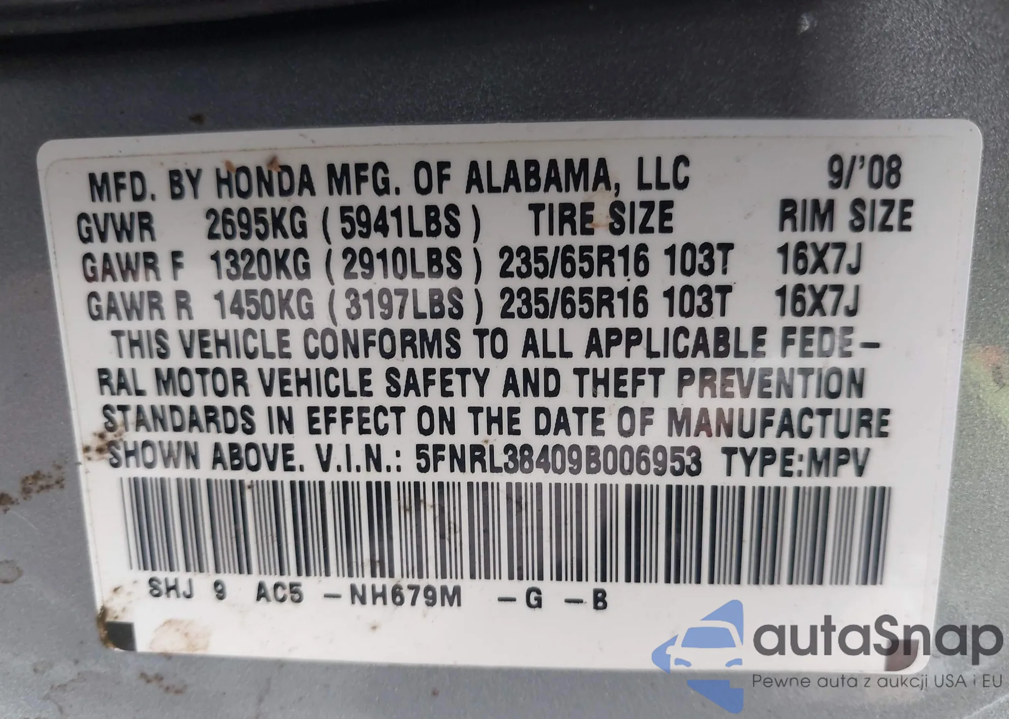 VIN: 5FNRL38409B006953