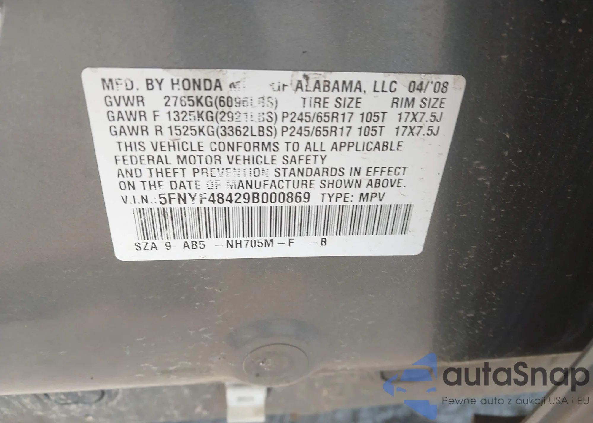 VIN: 5FNYF48429B000869