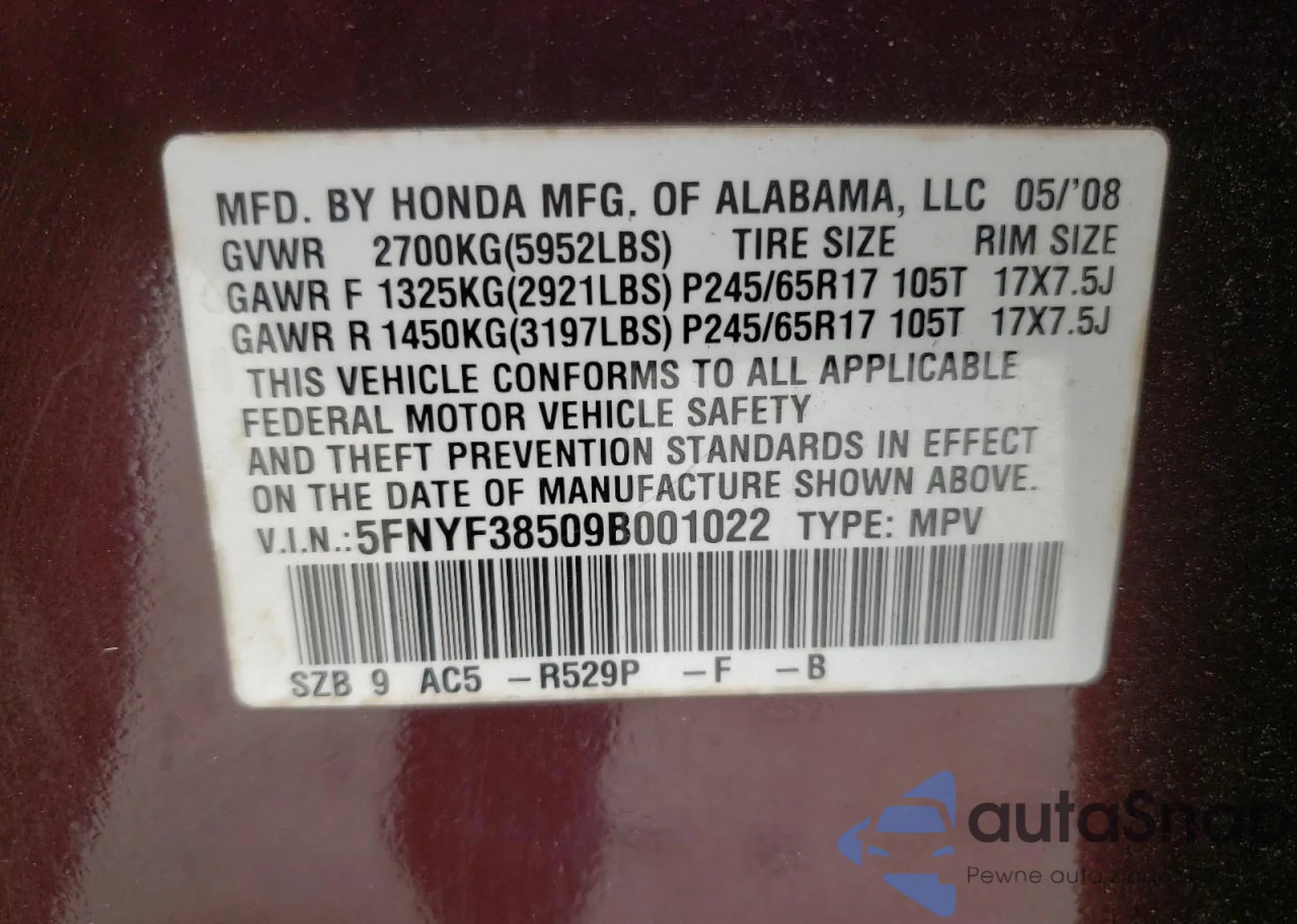 • VIN: 5FNYF38509B001022