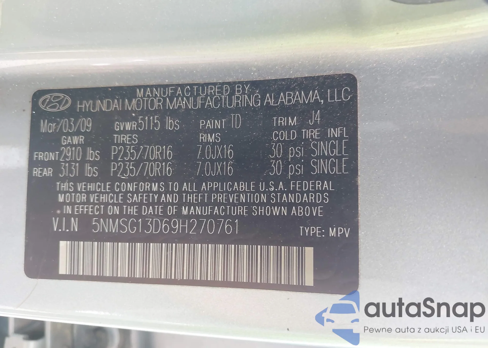 VIN: 5NMSG13D69H270761