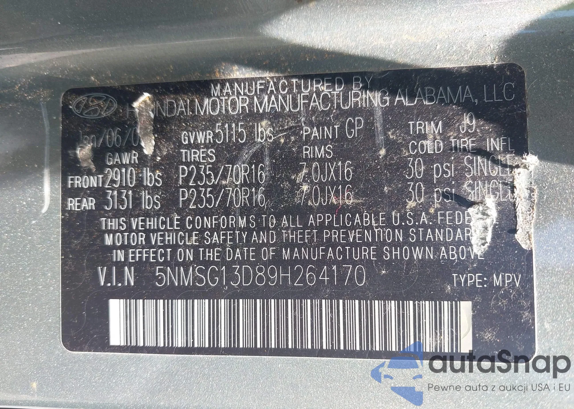 VIN: 5NMSG13D89H264170