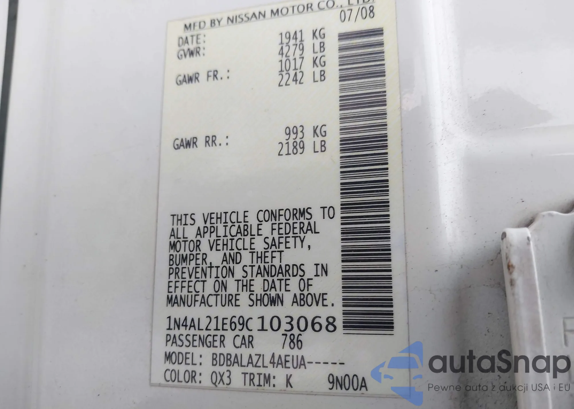 Автомобиль Nissan Altima 2009 (VIN 1N4AL21E69C103068) ранее не участвовал в торгах. Документы чистые, пробег соответствует или ниже среднего по рынку. Продаётся страховой компанией — рекомендуем покупку. Доставка в порт займет около 6–8 недель.