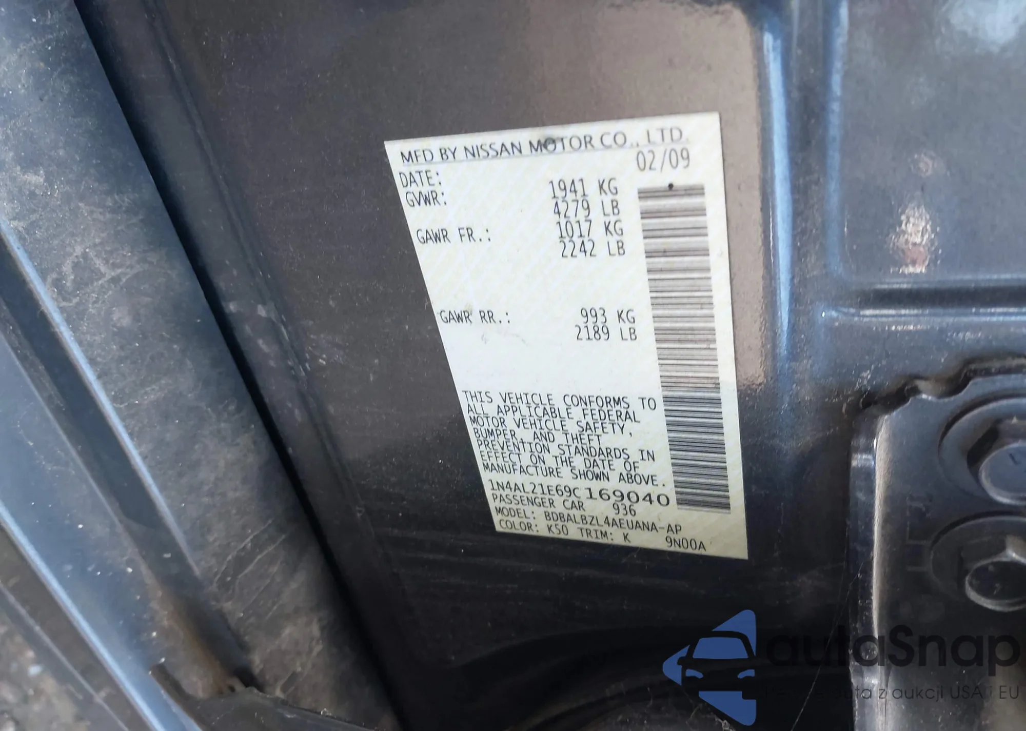 Автомобиль Nissan Altima 2009 (VIN 1N4AL21E69C169040) продаётся непроверенным продавцом. Рекомендуем проверить отчет Carfax и подтвердить возможность регистрации перед покупкой.