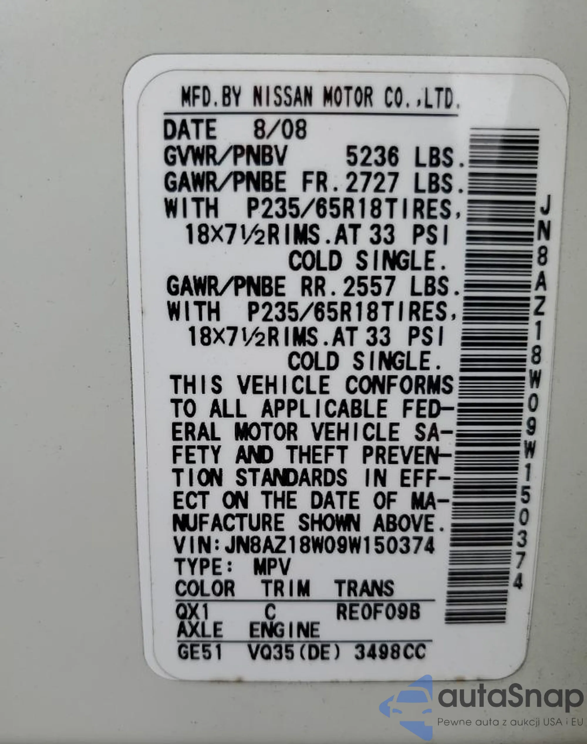 • VIN: JN8AZ18W09W150374