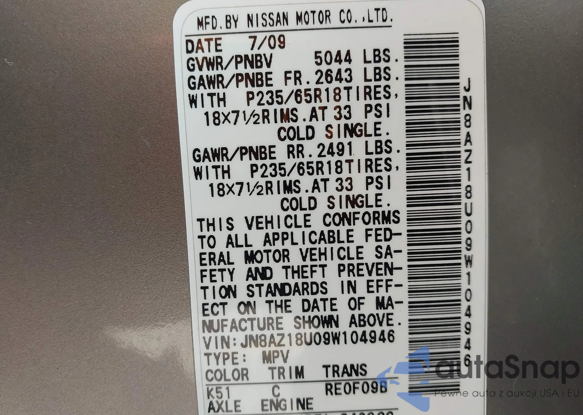 • VIN: JN8AZ18U09W104946