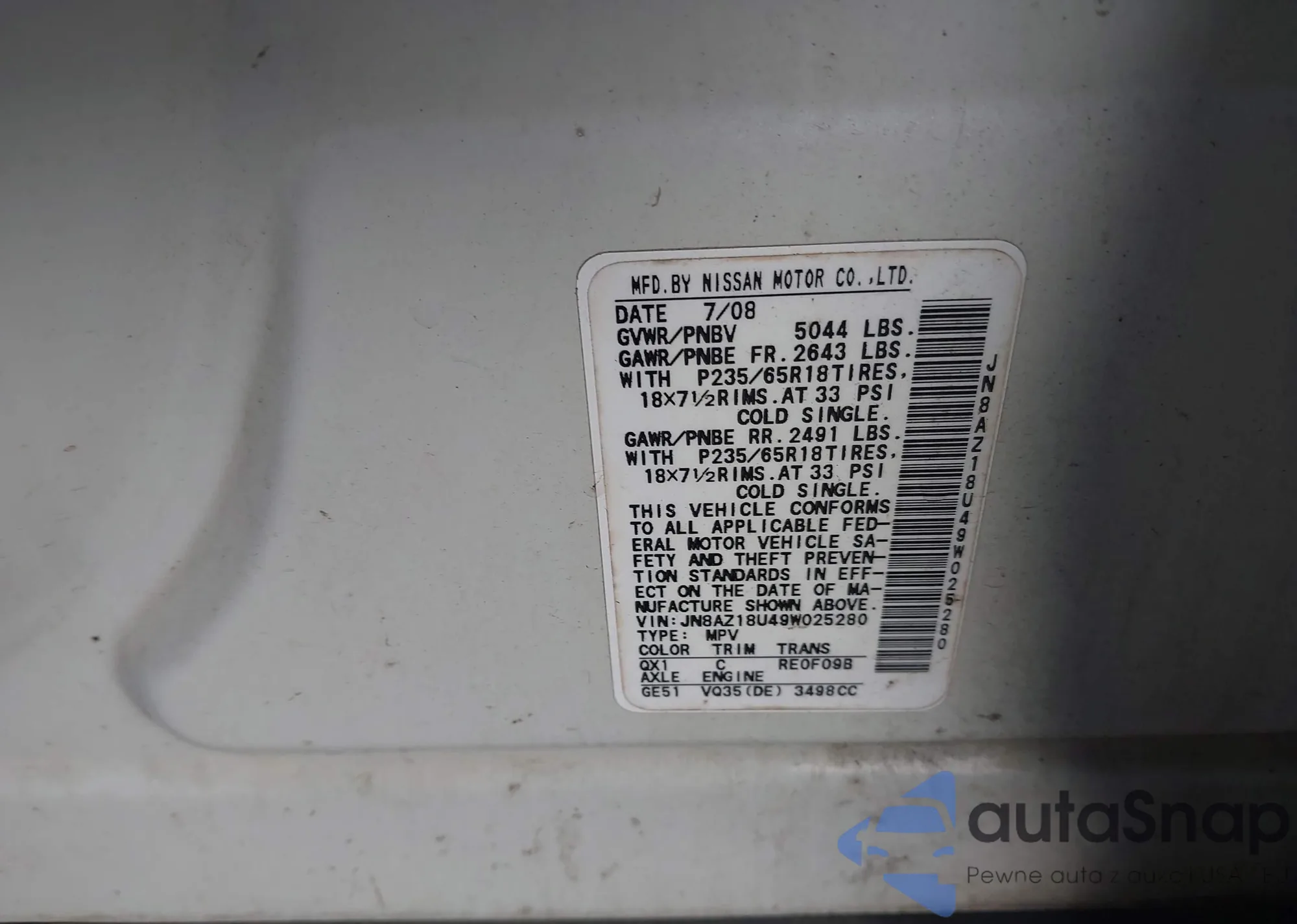 VIN: JN8AZ18U49W025280