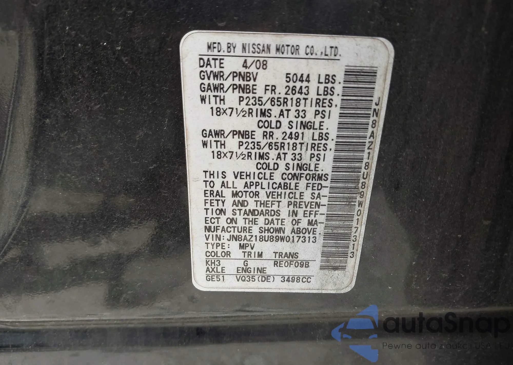 Автомобиль Nissan Murano 2009 (VIN JN8AZ18U89W017313) ранее не участвовал в торгах. Документы чистые, пробег соответствует или ниже среднего по рынку. Продаётся страховой компанией — рекомендуем покупку. Доставка в порт займет около 6–8 недель.