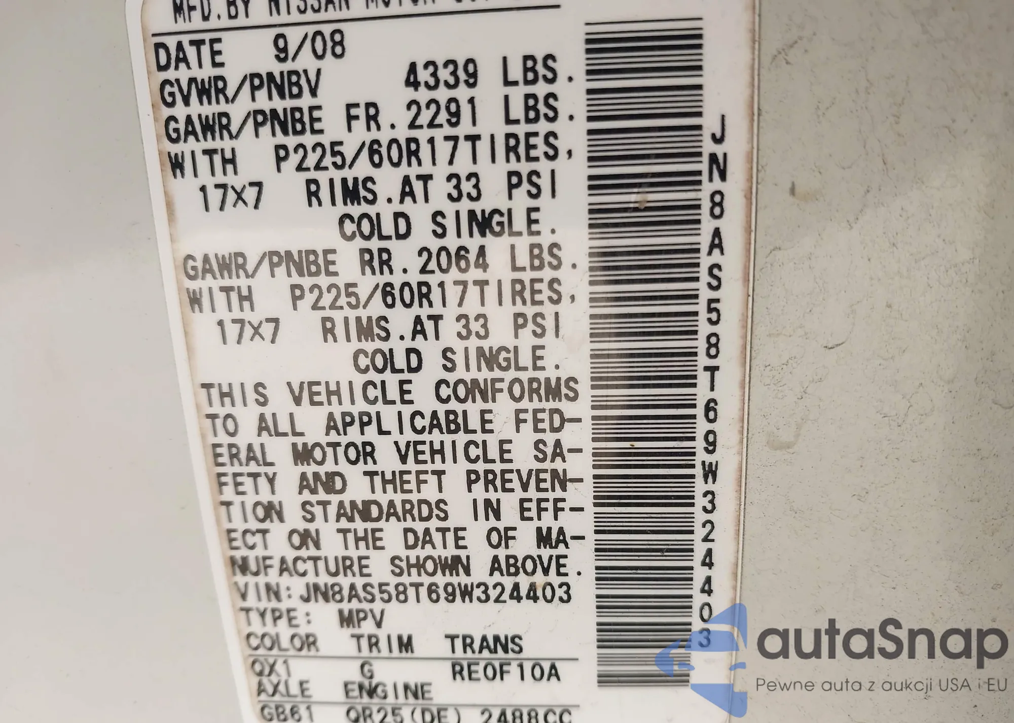 Автомобиль Nissan Rogue 2009 (VIN JN8AS58T69W324403) имеет документы, препятствующие регистрации. Могут возникнуть сложности при экспорте и регистрации. Обратитесь к экспертам AutaSnap для поиска альтернатив.