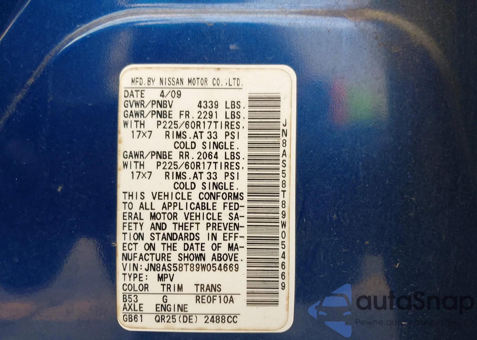 VIN: JN8AS58T89W054669