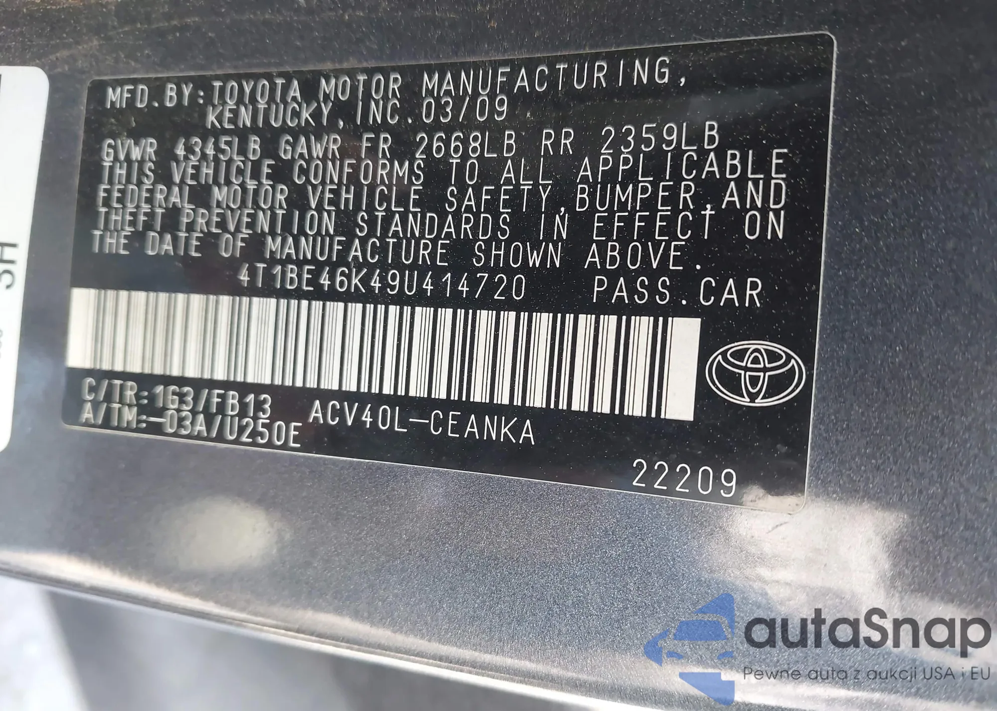 VIN: 4T1BE46K49U414720