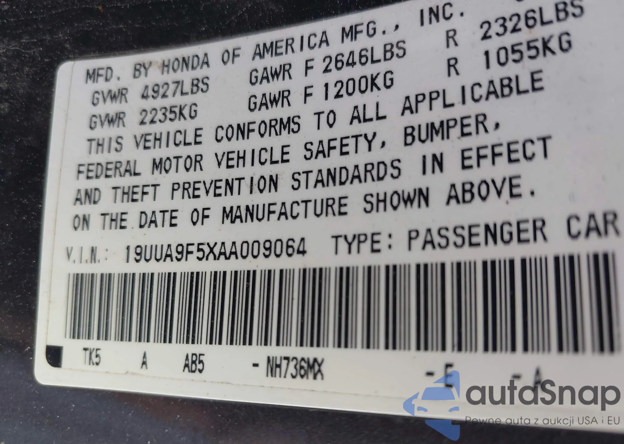 • VIN: 19UUA9F5XAA009064