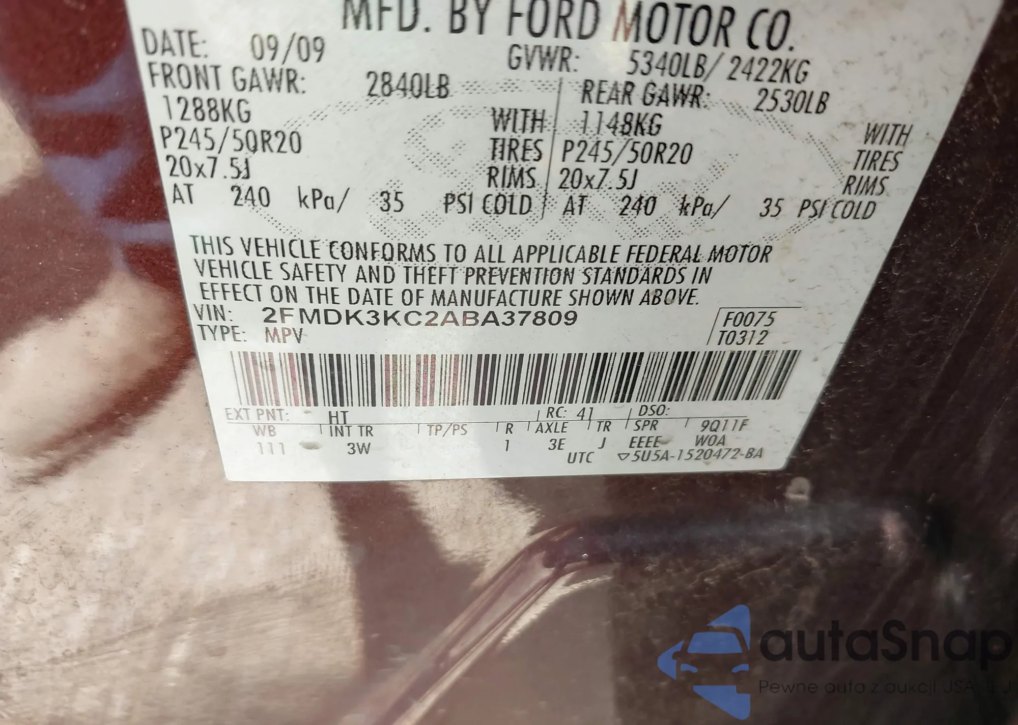 VIN: 2FMDK3KC2ABA37809