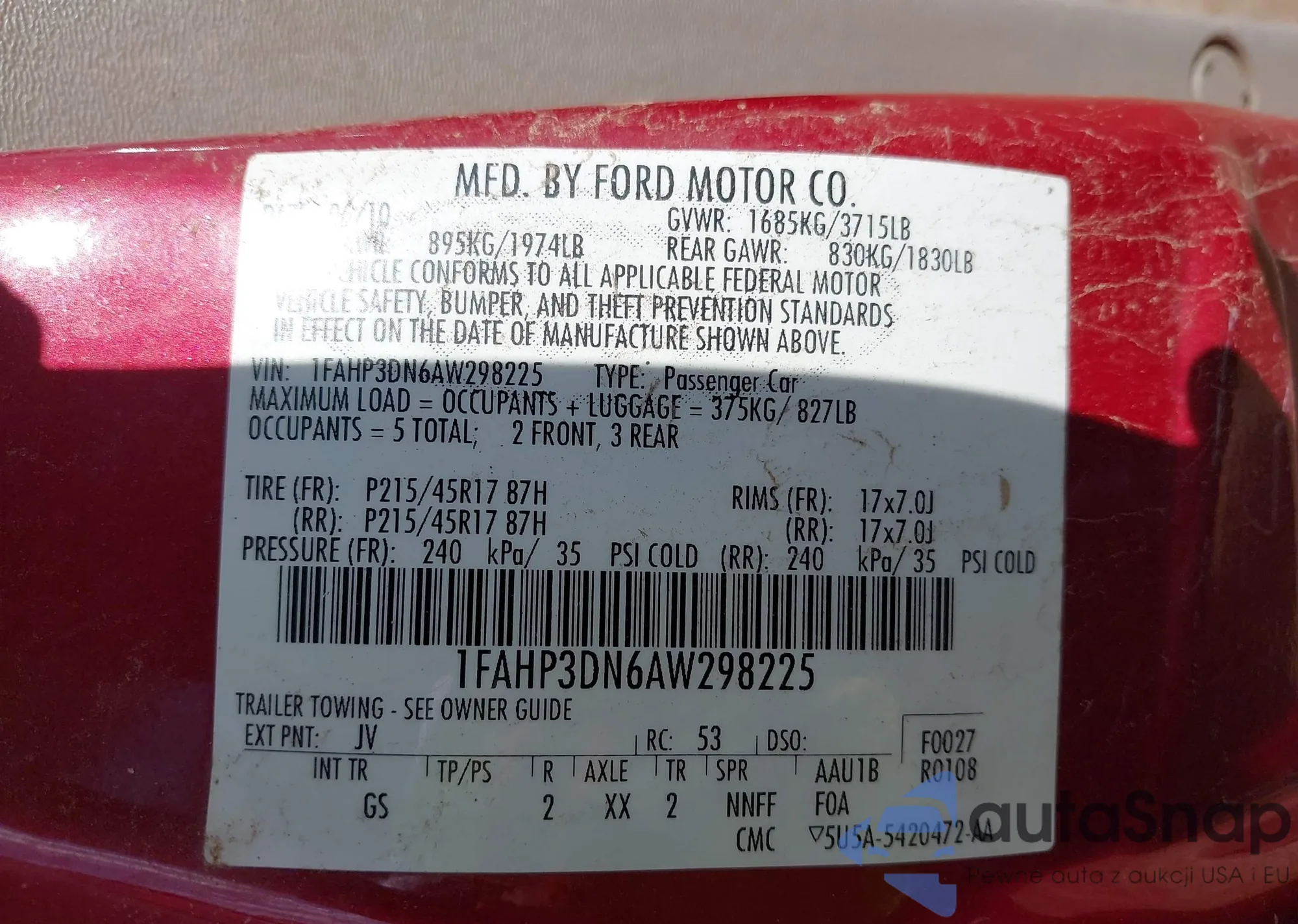 VIN: 1FAHP3DN6AW298225