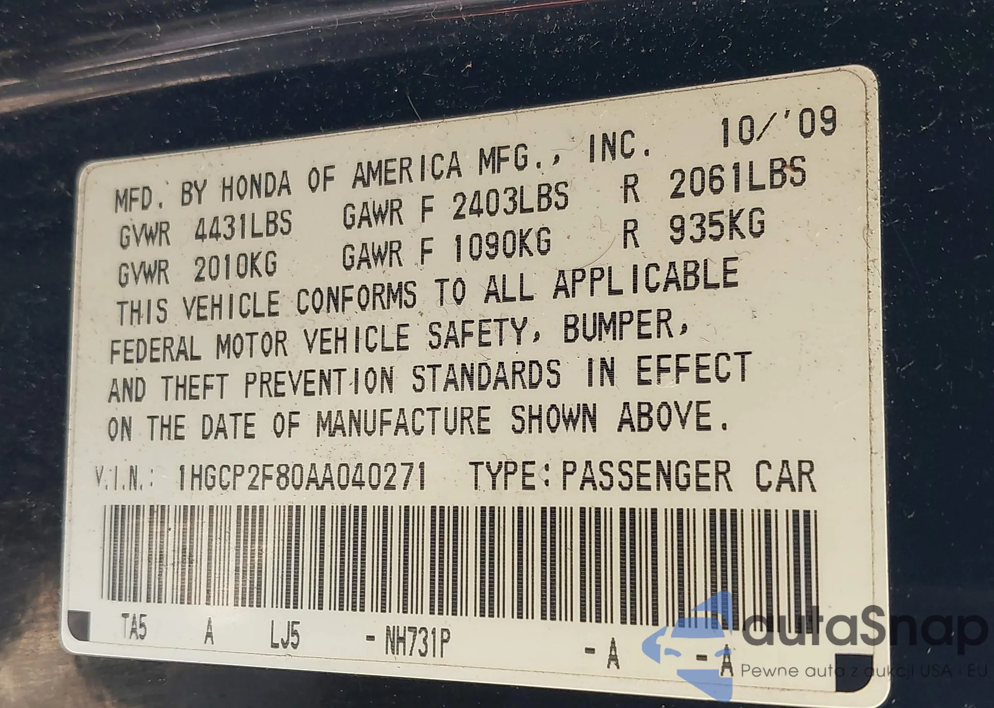 VIN: 1HGCP2F80AA040271
