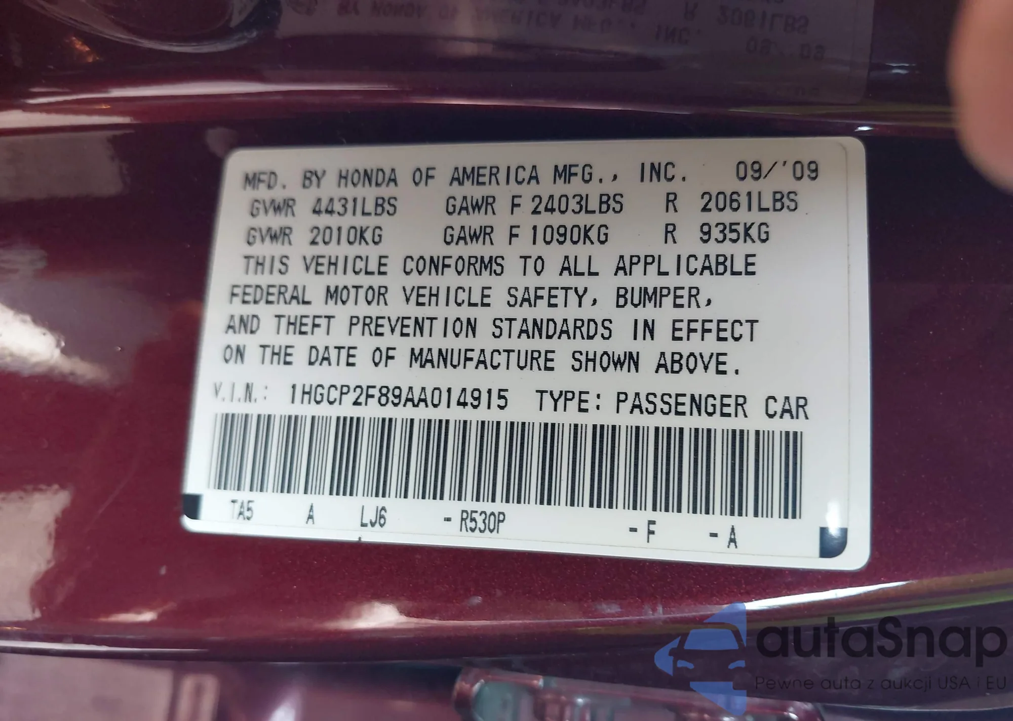 VIN: 1HGCP2F89AA014915