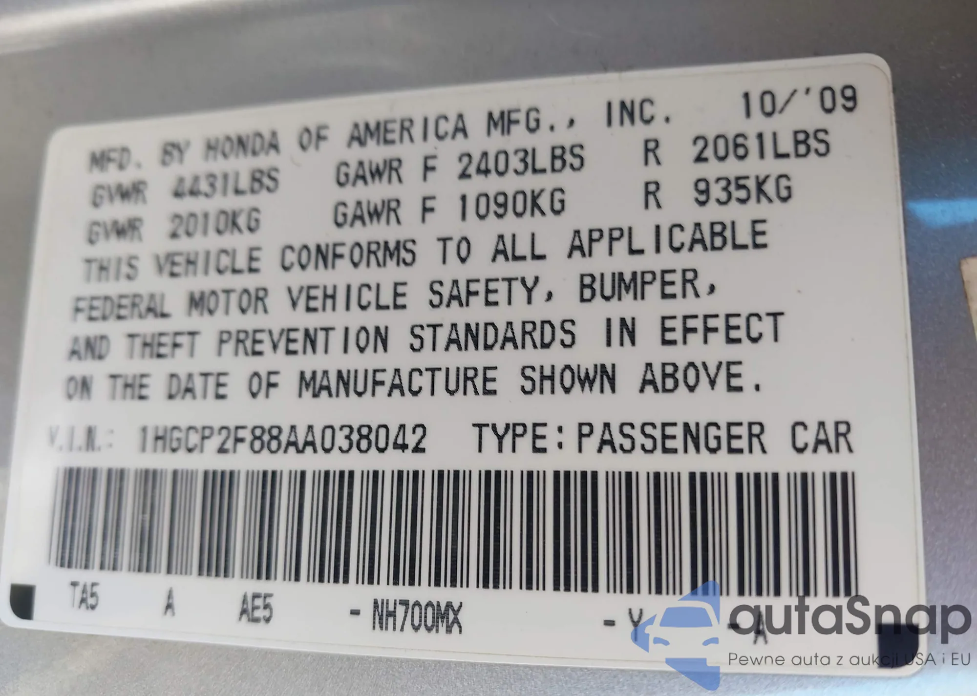 VIN: 1HGCP2F88AA038042