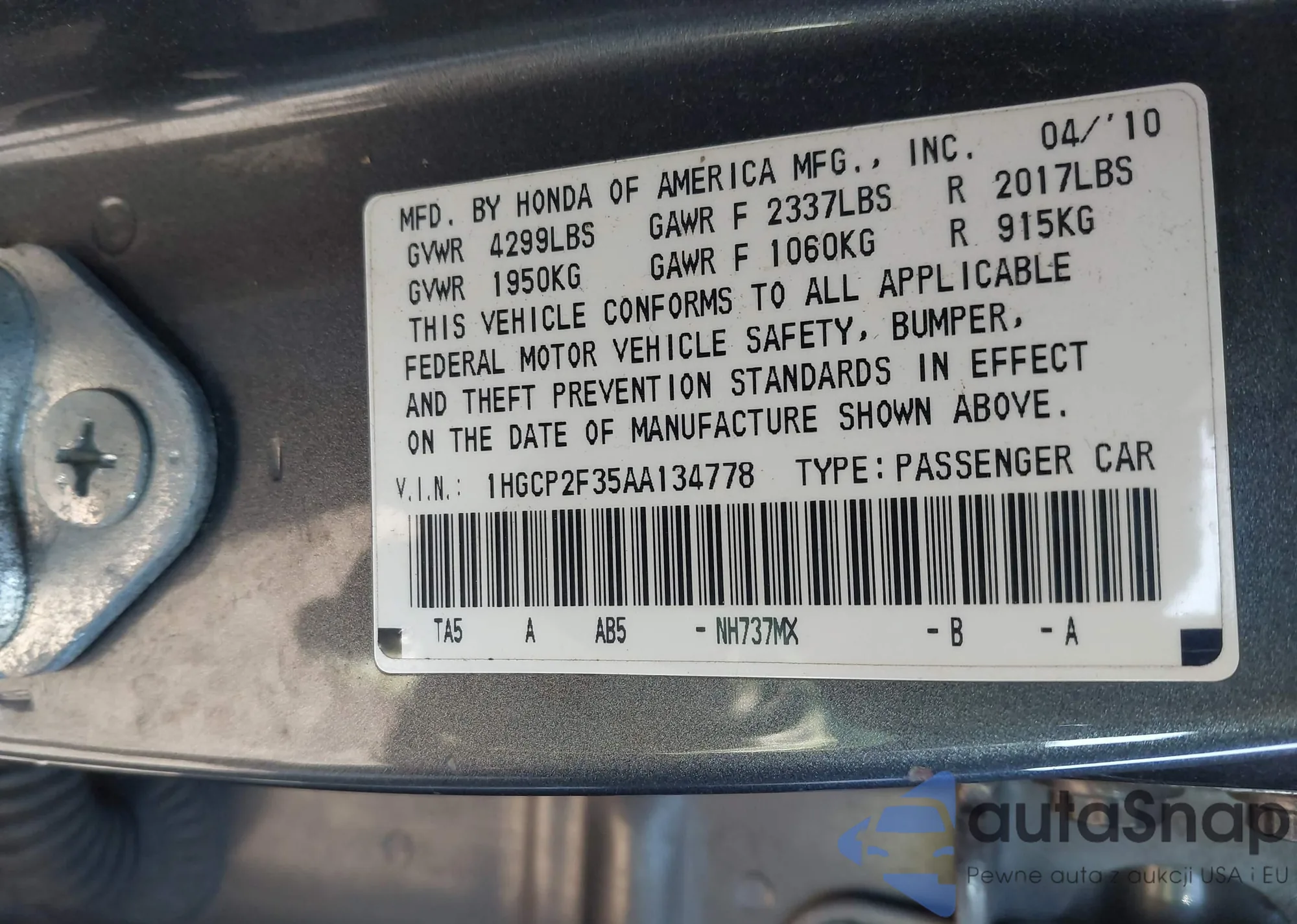 VIN: 1HGCP2F35AA134778